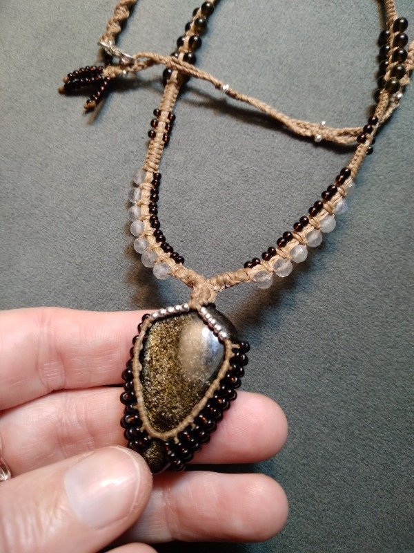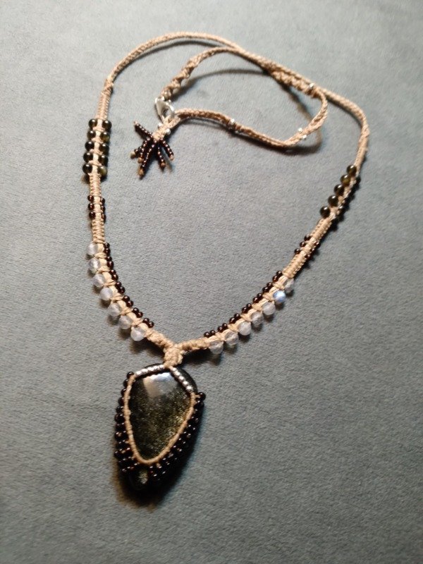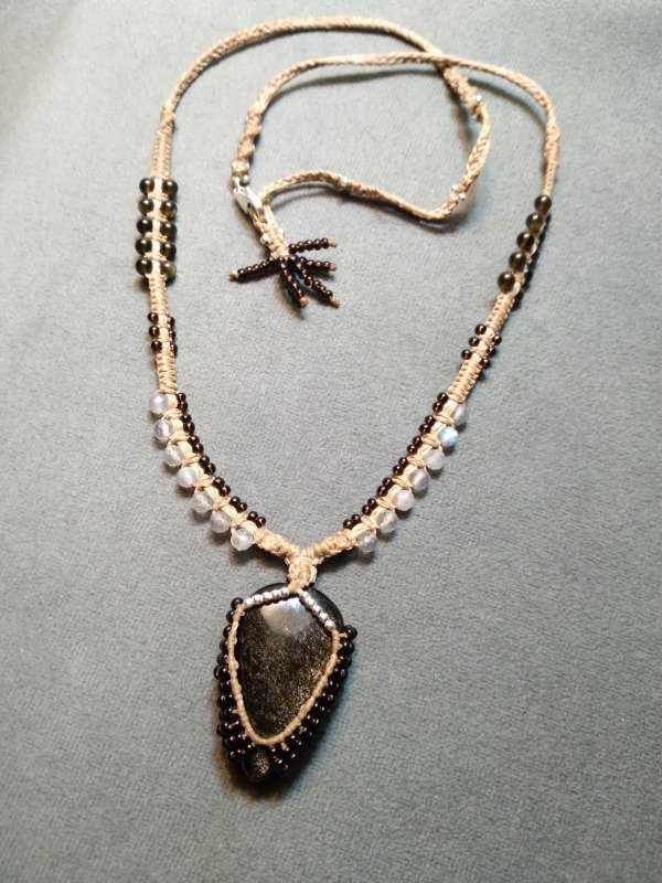 Collar tipo amuleto con piedra Obsidiana dorada como dije central, perlas de plata 925, labradorita azul facetada, obsidiana dorada en bolitas y mostacillas de vidrio checo.