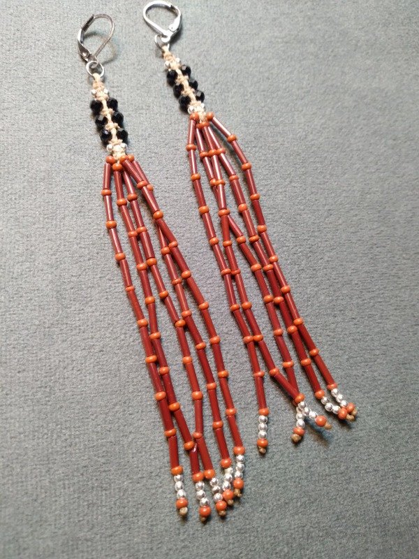 Aros tejidos en micromacramé con Espinella negra facetada, cuentas de plata 925, mostacillas y canutillos de vidrio checo.