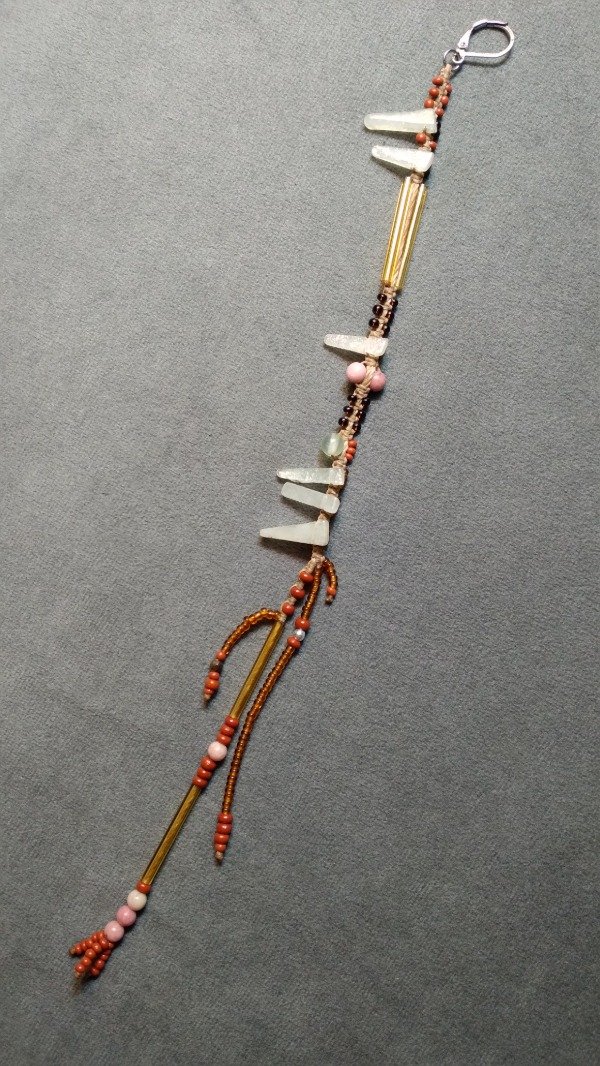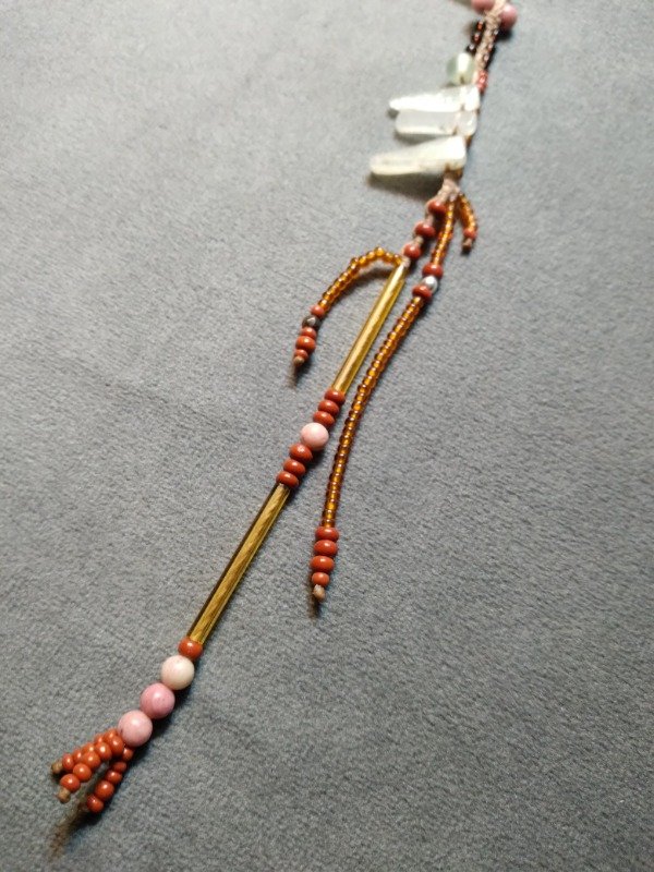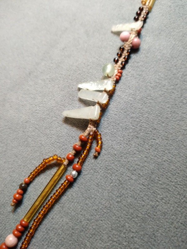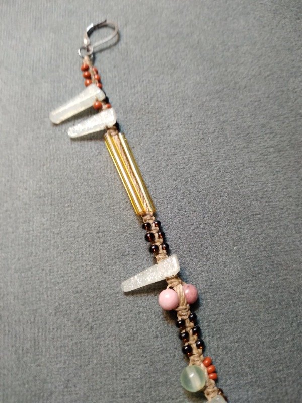 Solitario tejidoenmicromacramé con rodonita, cuarzo verde, aventurina, ojo de tigre, cuentas de plata 925, canutillos y mostacillas checas.
