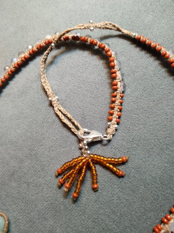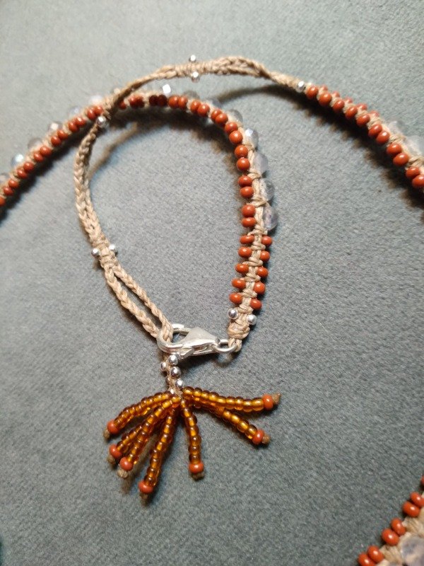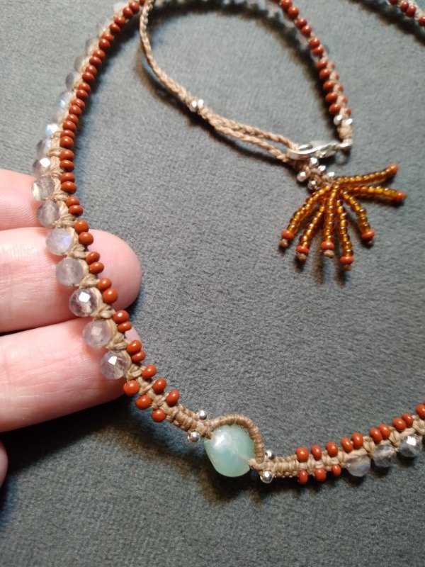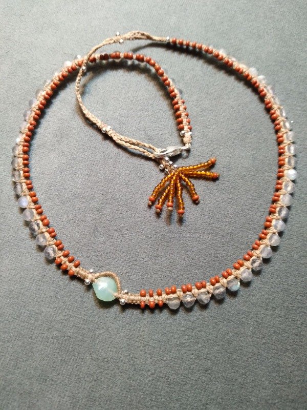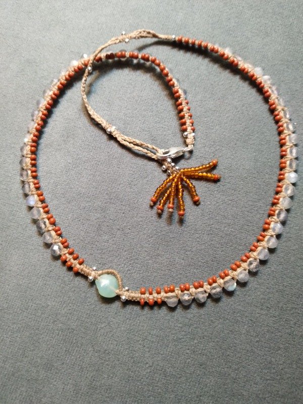 Gargantilla tejida en micromacramé., con piedra Crisoprasa, perlas de plata 925, labradorita azul facetada y mostacillas de vidrio checo.