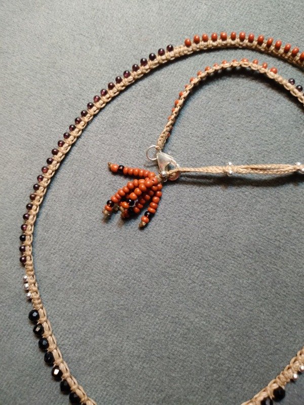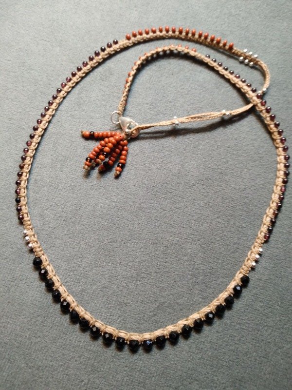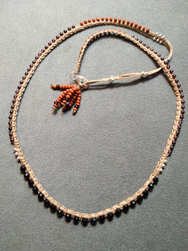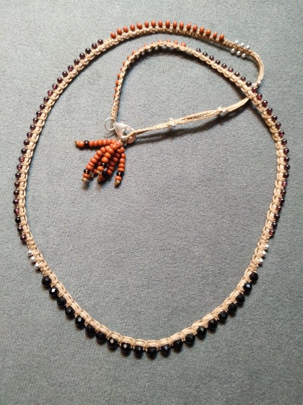 Gargantilla tejida en micromacramé., con piedra Espinella negra facetada, perlas de plata 925, Granate de 2mm y mostacillas de vidrio checo.