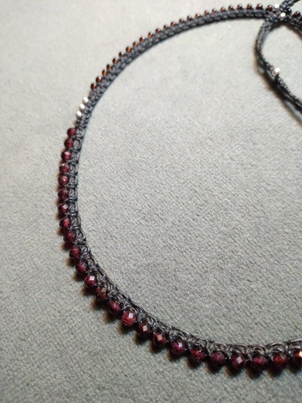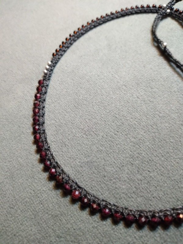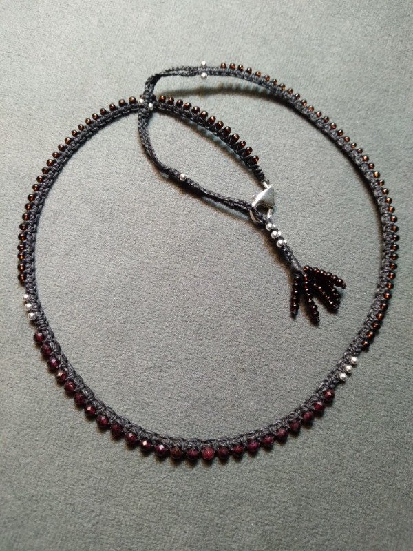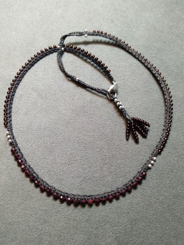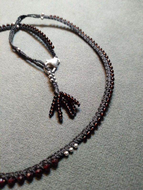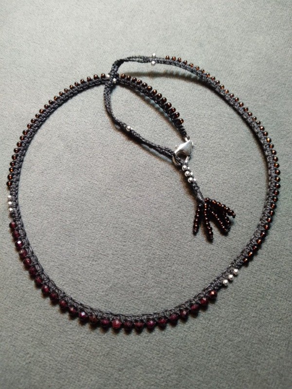 Gargantilla tejida en micromacramé., con Granate facetada, perlas de plata 925 y mostacillas de vidrio checo.