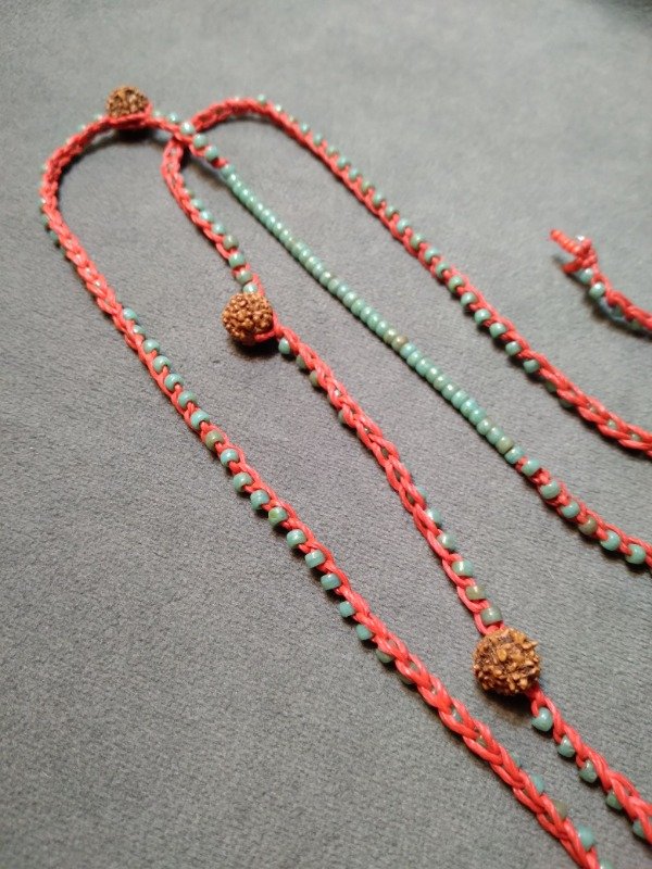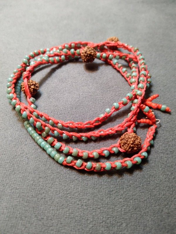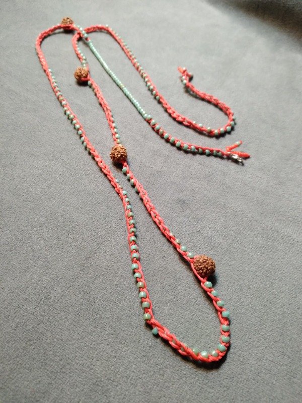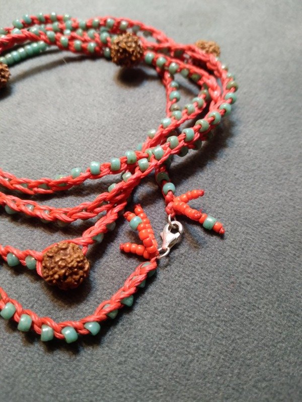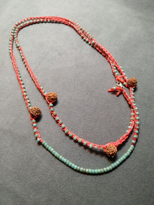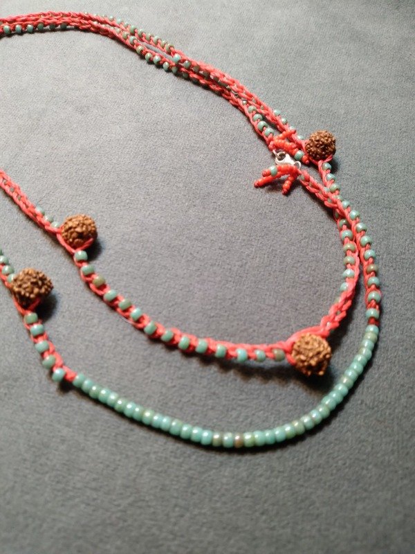 Gargantilla tejida en micromacramé., con mostacillas de vidrio checo y semillas Rudraksha.