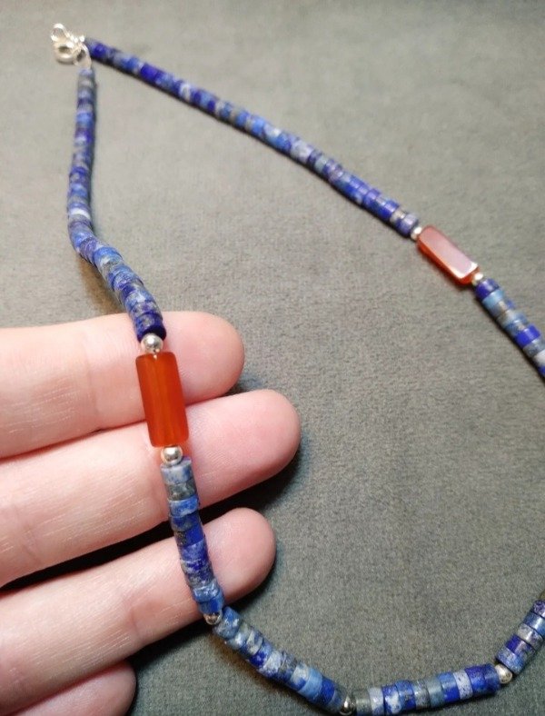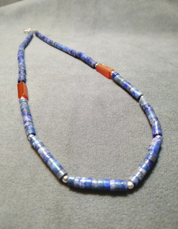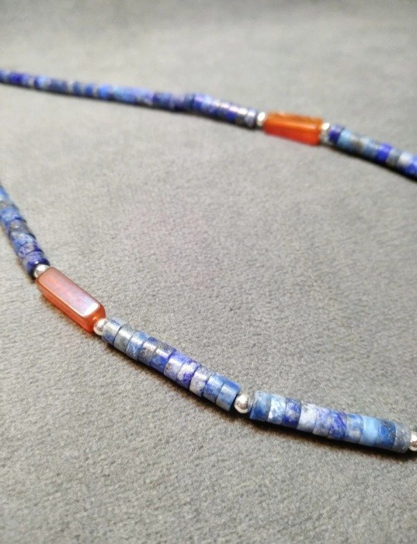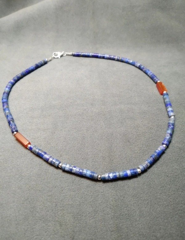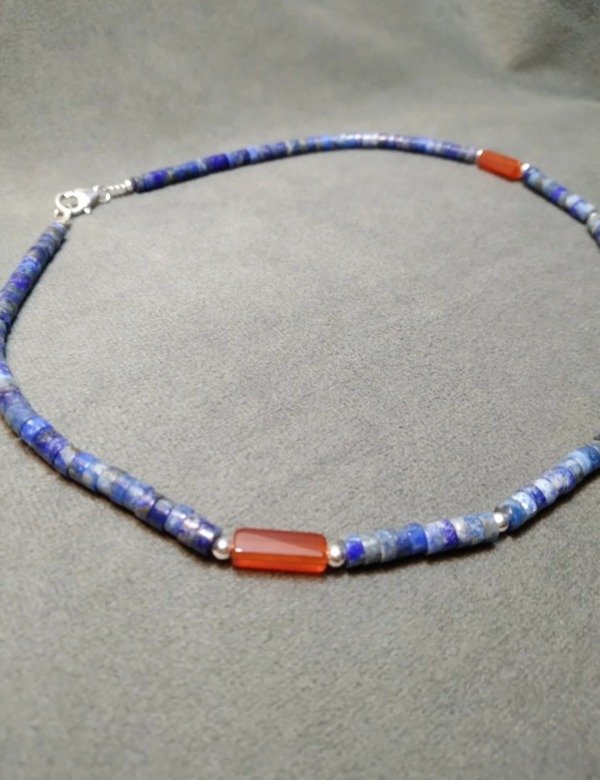 Gargantilla con piedra lapislázuli , detalles en ágata cornalina, bolitas y cierre de plata 925.