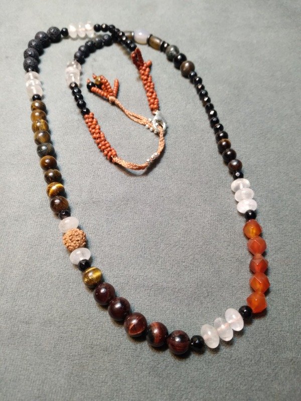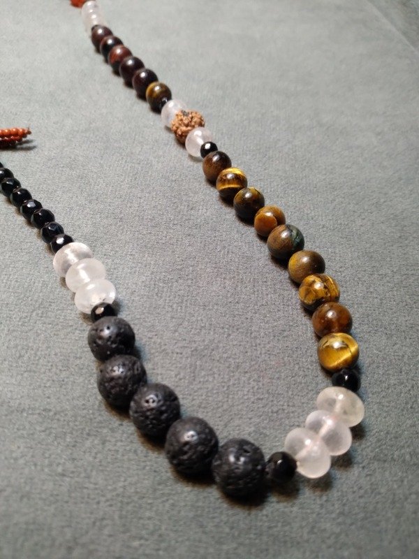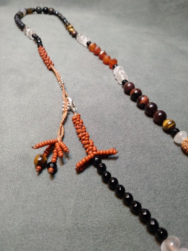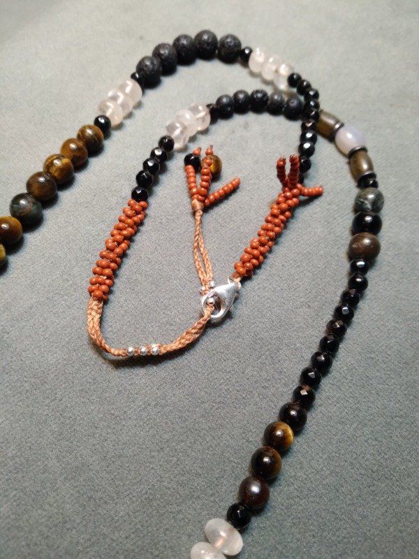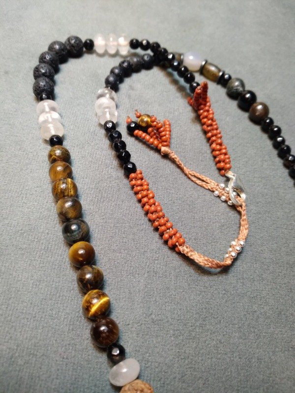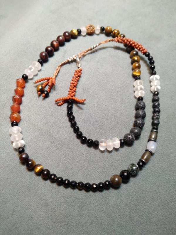 Gargantilla tejida en micromacramé., con piedras Ojo de tigre, ágata Botswana, ojo de tigre rojo, piedra volcánica, cuarzo cristal, labradorita, cornalina, ágata, semillas y mostacillas de vidrio checo.