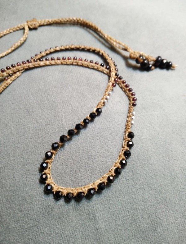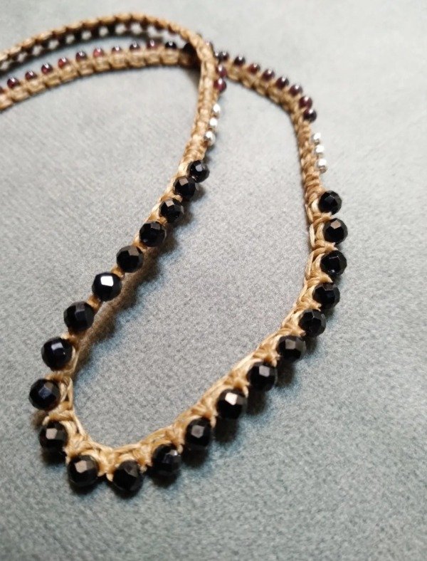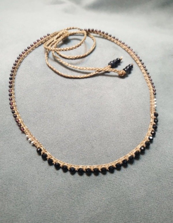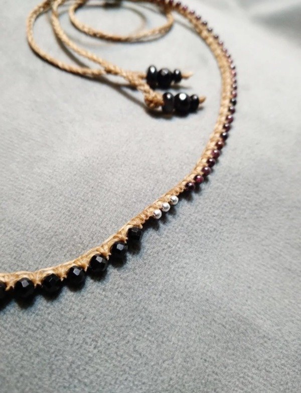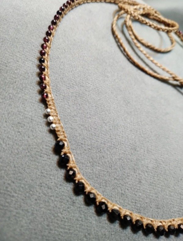 Gargantilla tejida en micromacramé con Spinella negra facetada, mini Granate y detalles en plata 925.