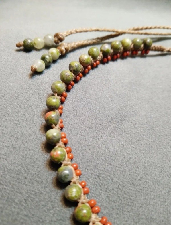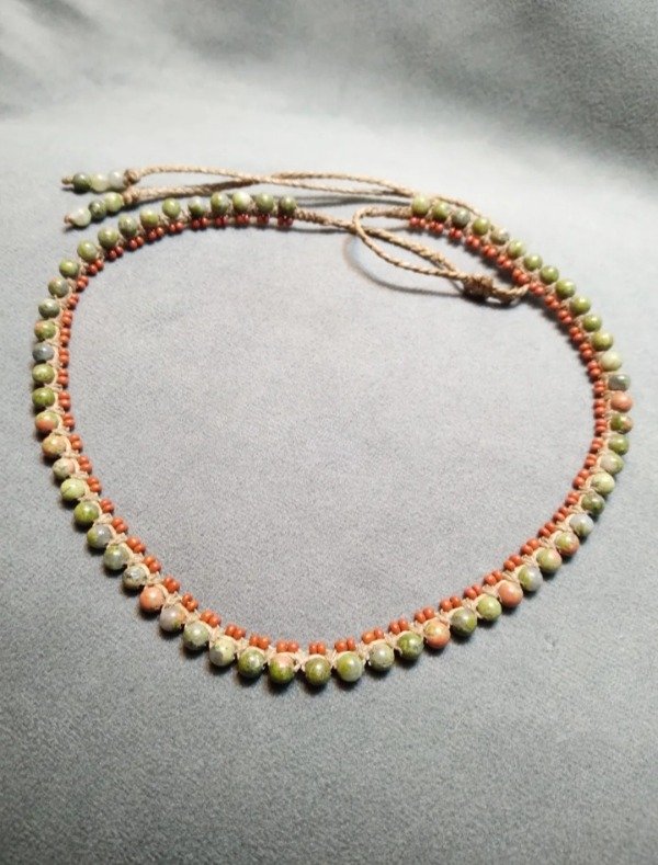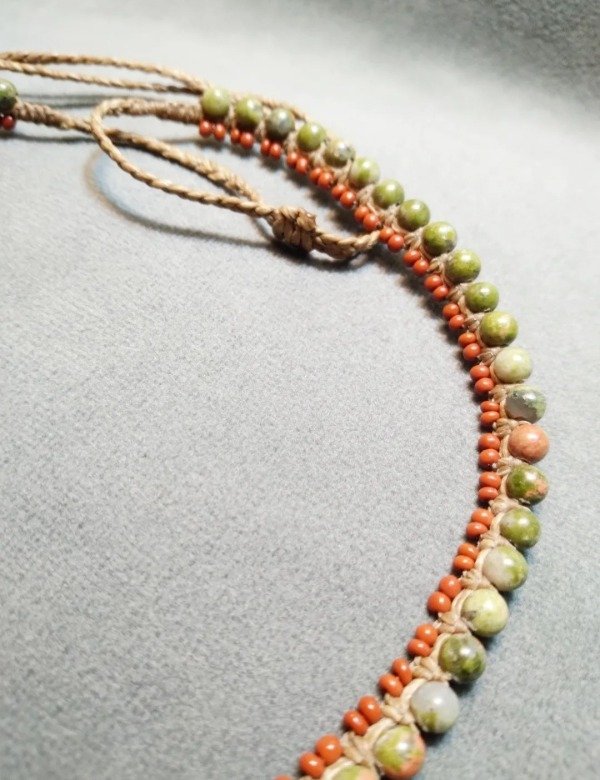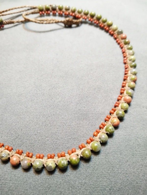 Gargantilla tejida en micromacramé con unakita de 4mm y mostacillas de vidrio checo.