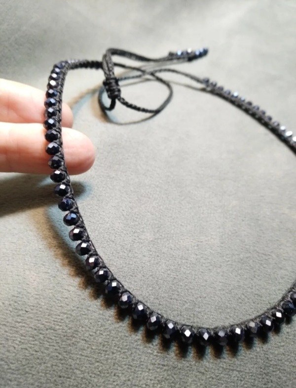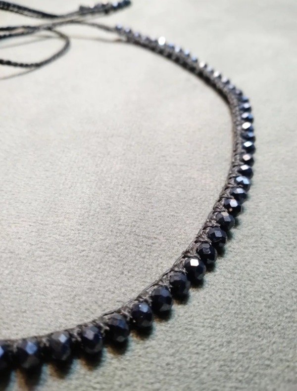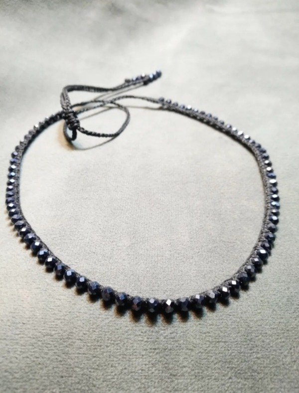 Gargantilla tejida en micromacramé con mini cristales de vidrio facetado (cristal de roca) 3mm. color peltre.