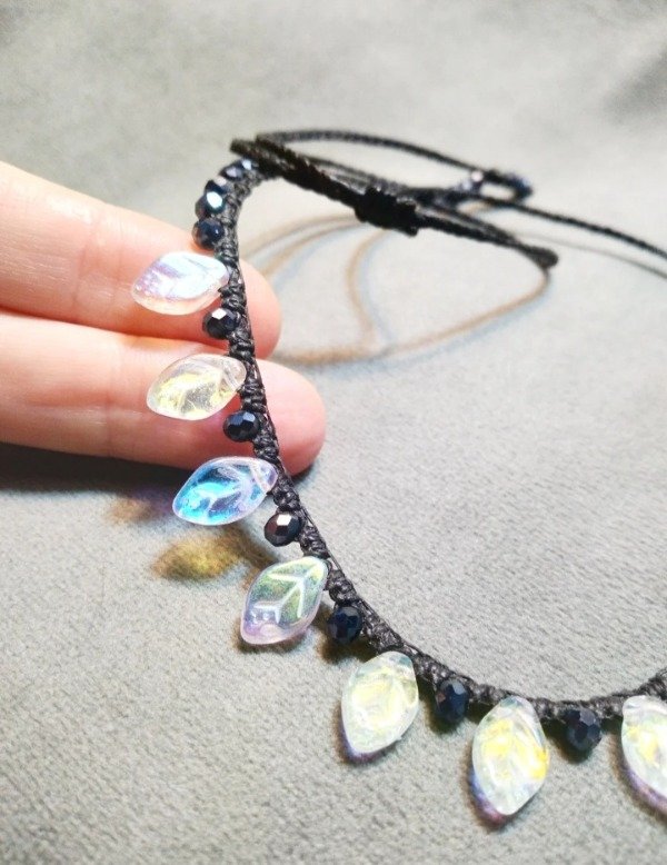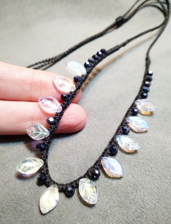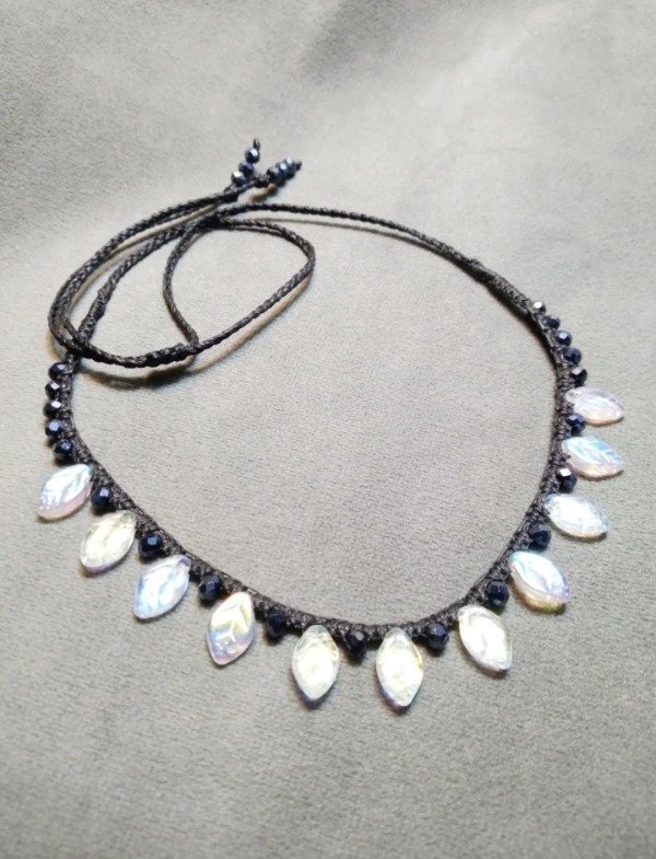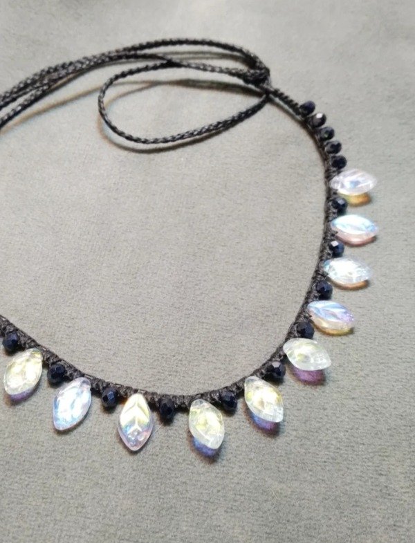 Gargantilla tejida en micromacramé con hojitas de vidrio japones (miyuki) color tornasol blanco y cristales de vidrio facetado (cristal de roca) 3mm. color peltre.