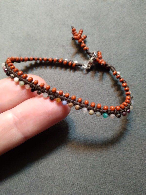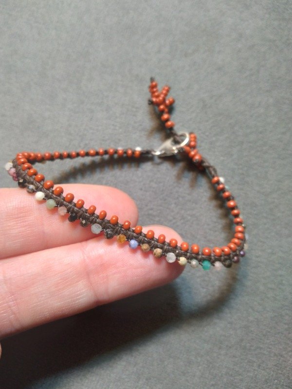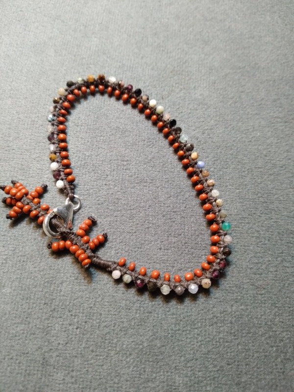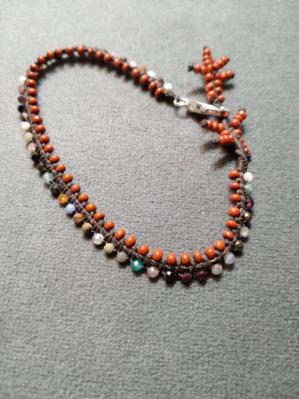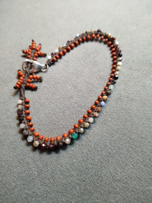Pulsera tejida en micromacramé con mix de mini piedras facetadas, cuentas de plata 950 y mostacillas de vidrio checo.