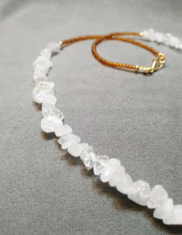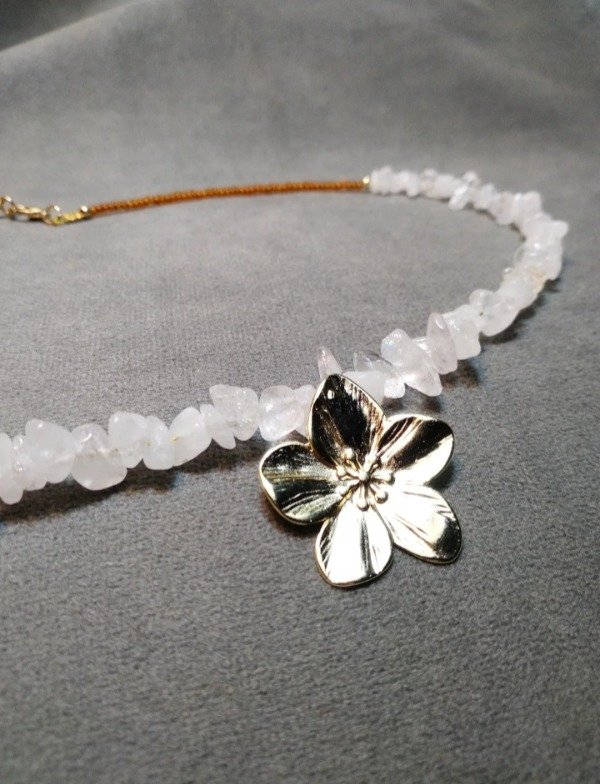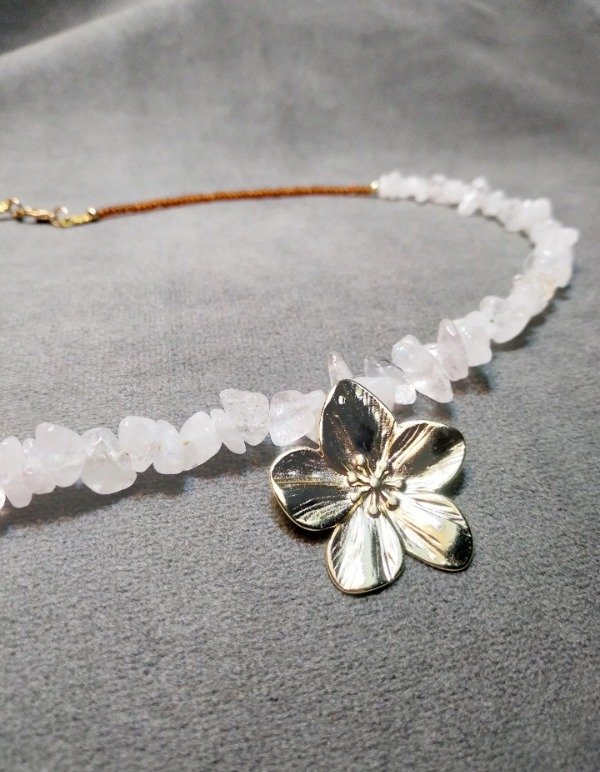 Gargantilla con Flor de acero dorado, cuarzo cristal y mostacillas de vidrio checo.