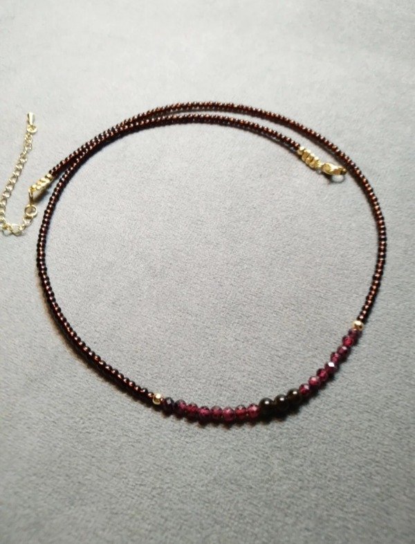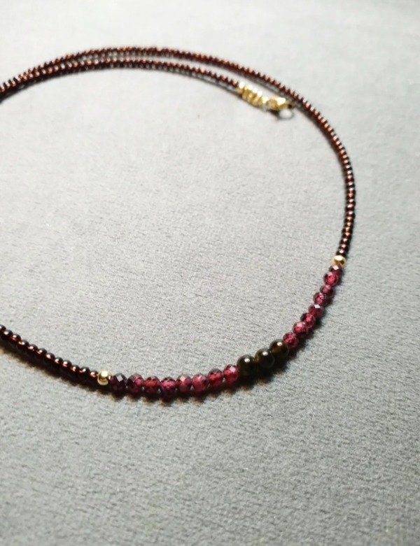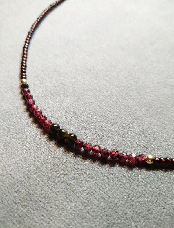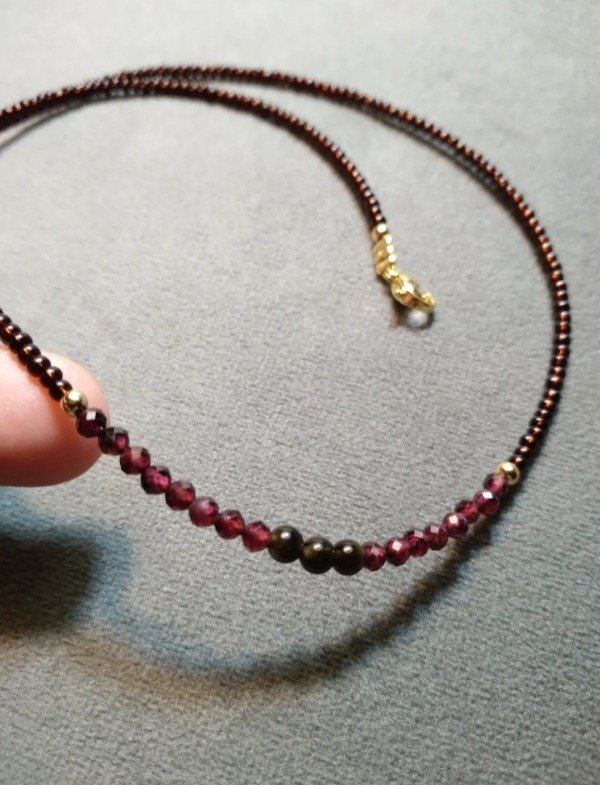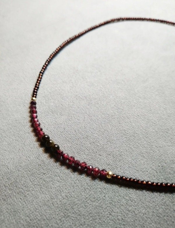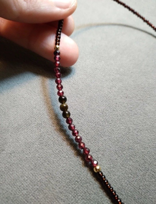 Gargantilla con obsidiana dorada (4mm.), granate facetada (3mm.), bolitas laminadas en oro 18k y mostacillas de vidrio checo.