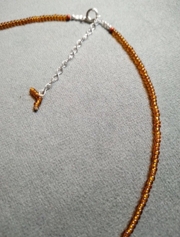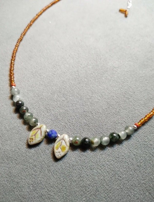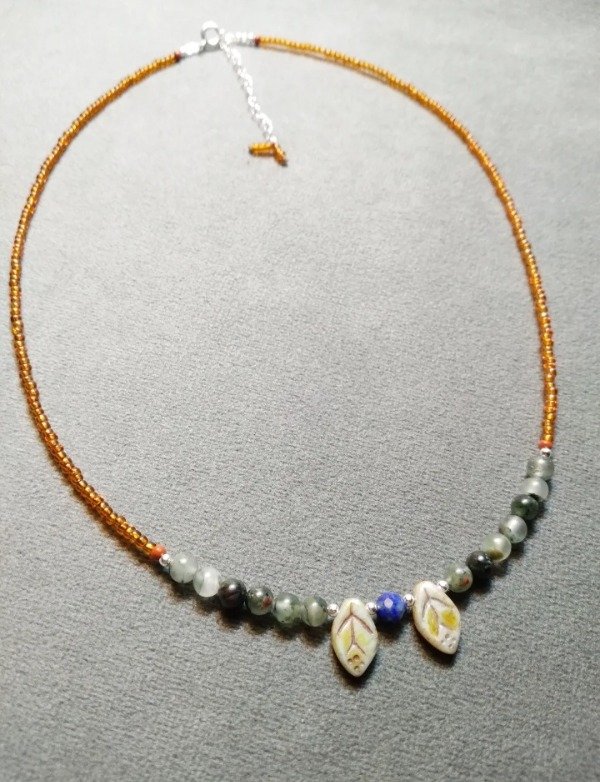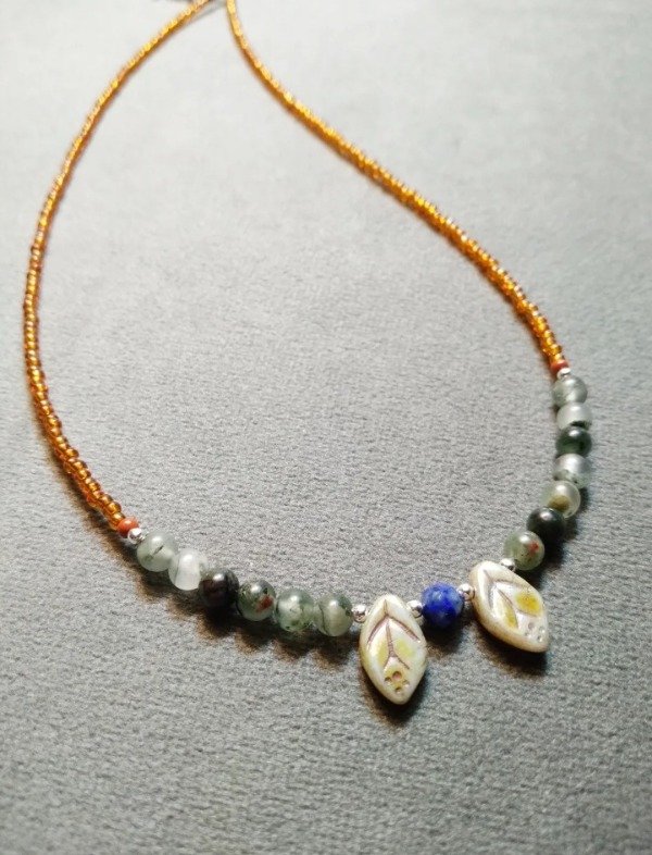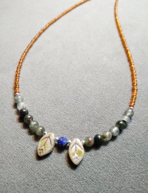 Gargantilla hojitas de vidrio japonés, piedra lapislázuli afgano en el centro, piedra heliotropo, cuentas de plata 925 y mostacillas de vidrio checo.