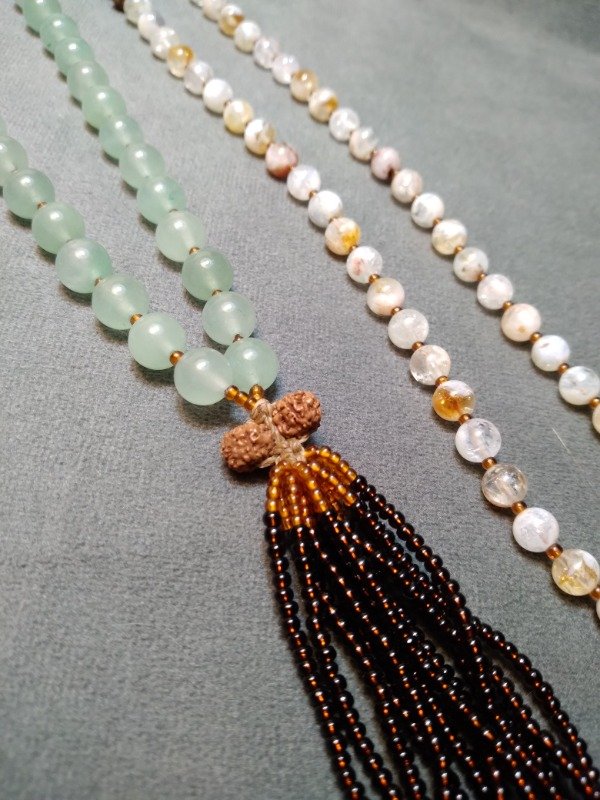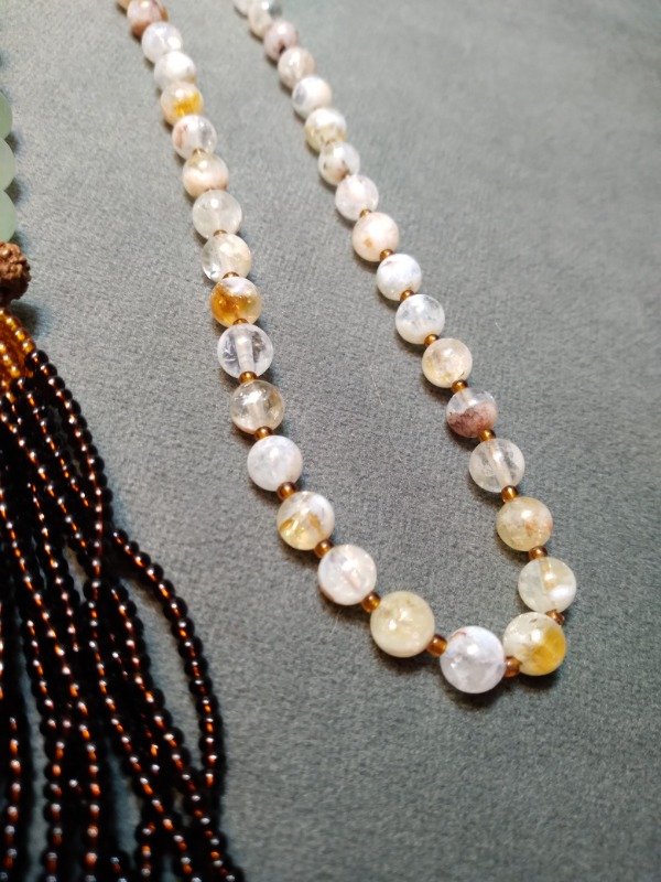 Con piedras de cuarzo verde, citrino y semillas Rudraksha.