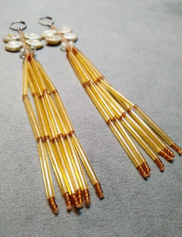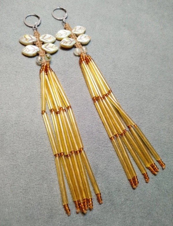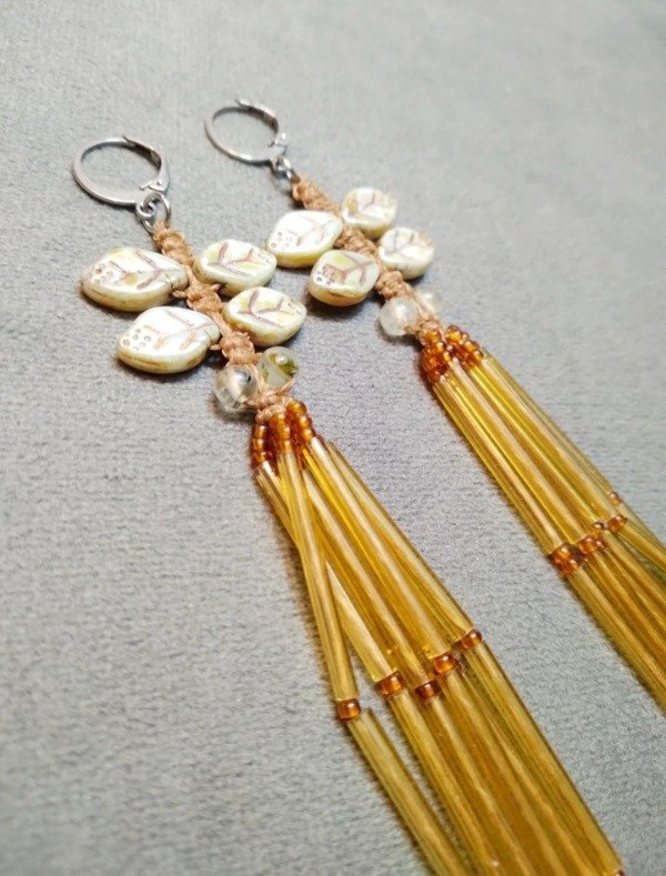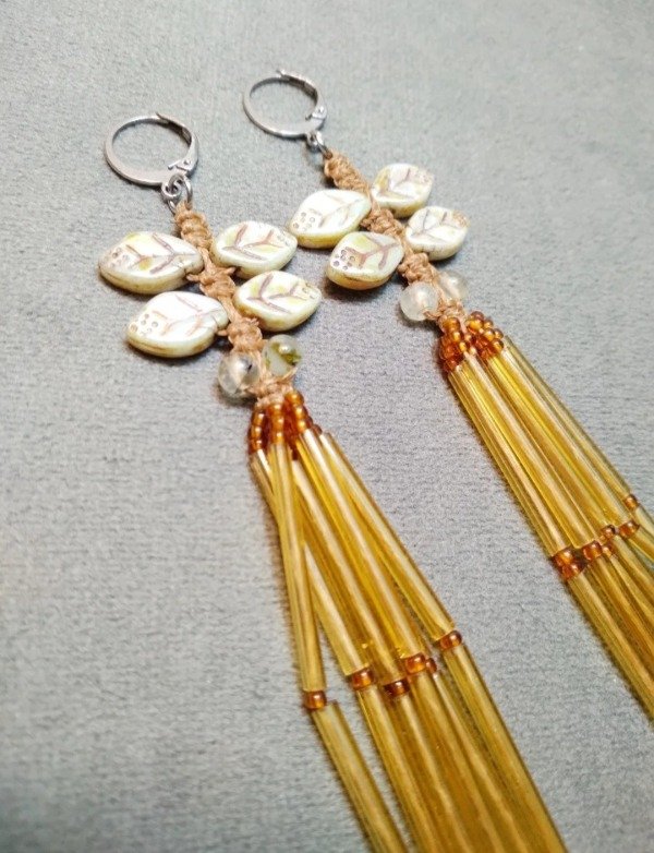 Aros tejidos en micromacramé con piedra prehnita, hojitas de vidrio japones, mostacillas y canutillos de vidrio checo.