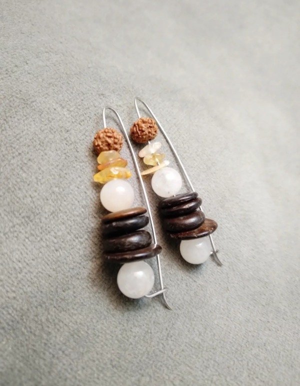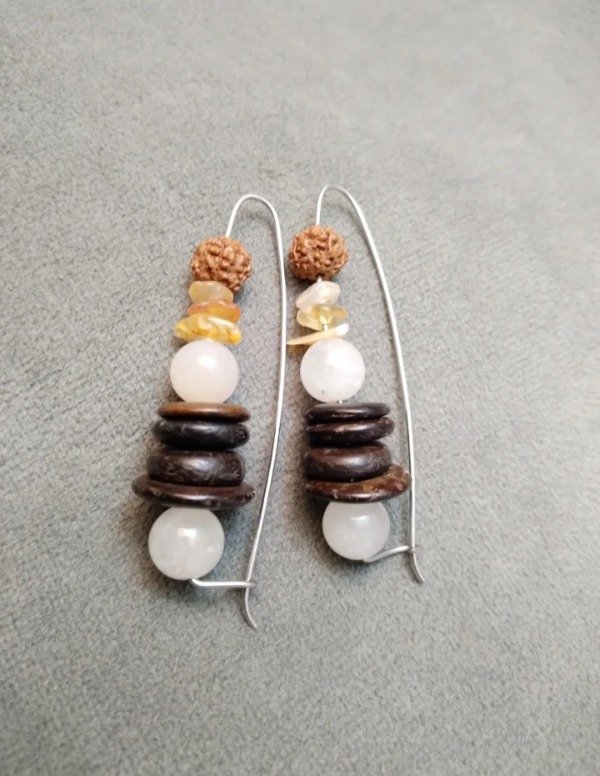 Aros con cuarzo blanco, madera de coco, ágata y semillas Rudraksha.