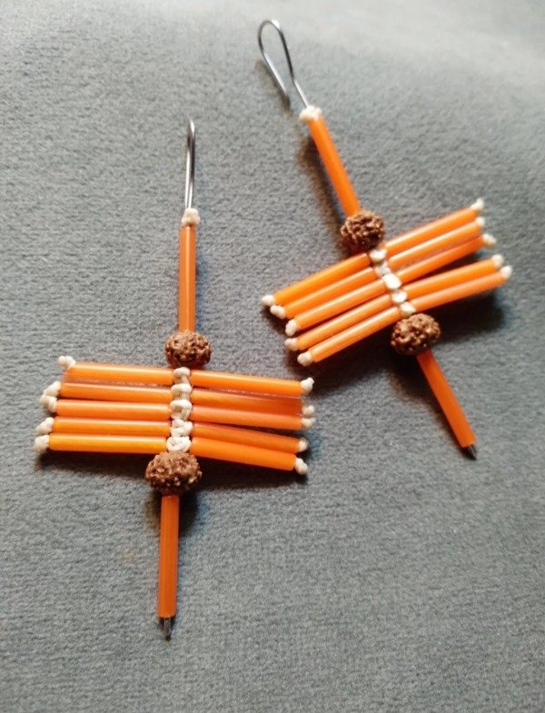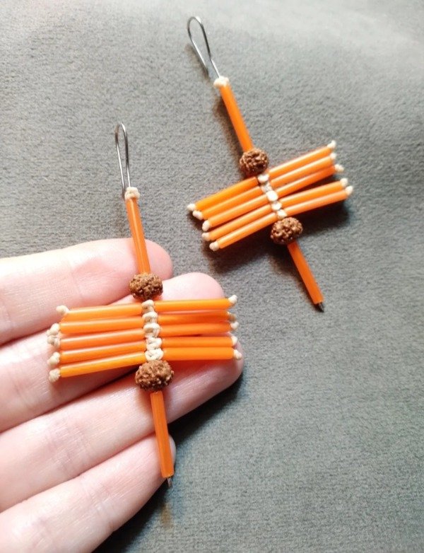 Aros tejidos en micromacramé con canutillos de vidrio checo y semillas Rudraksha.