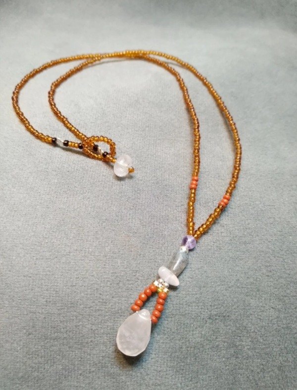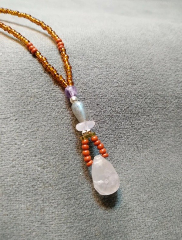 Colgante con gota facetada de cuarzo rosa (1.5x1cm), labradorita, amatista, mostacillas de vidrio checo y detalles en plata 925.