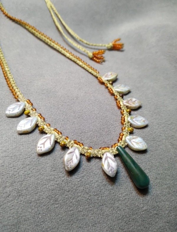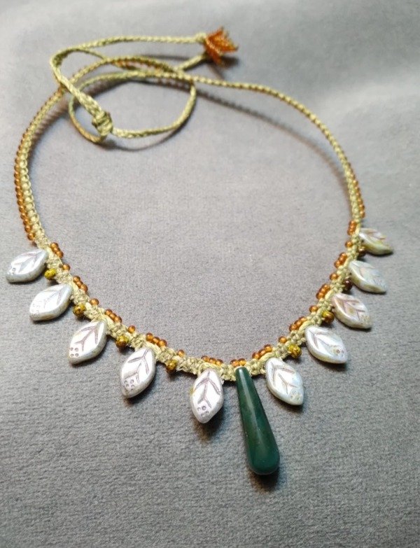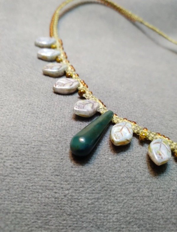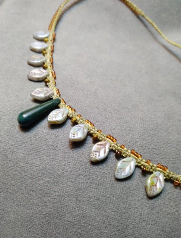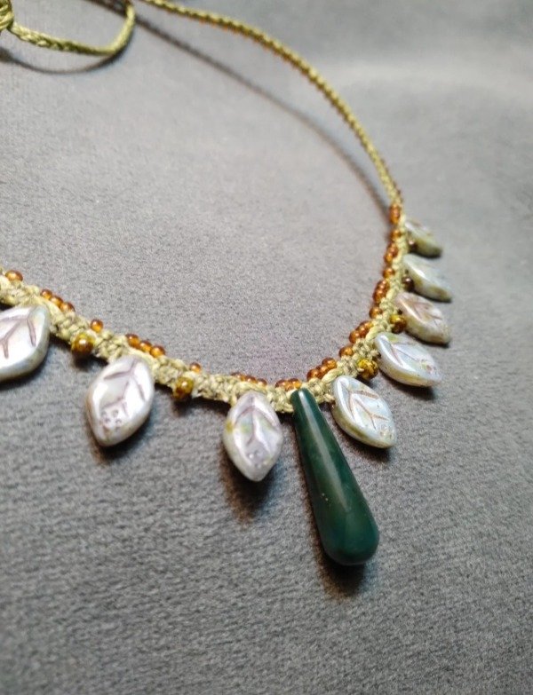 Gargantilla tejida en micromacramé con hojitas de vidrio japonés, piedra Jaspe en el centro, obsidiana dorada, mostacillas de vidrio checo.