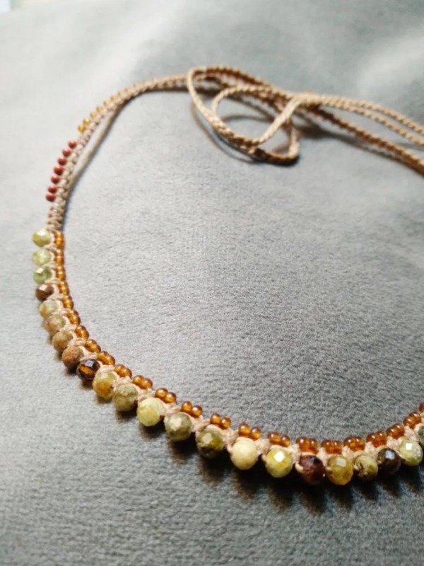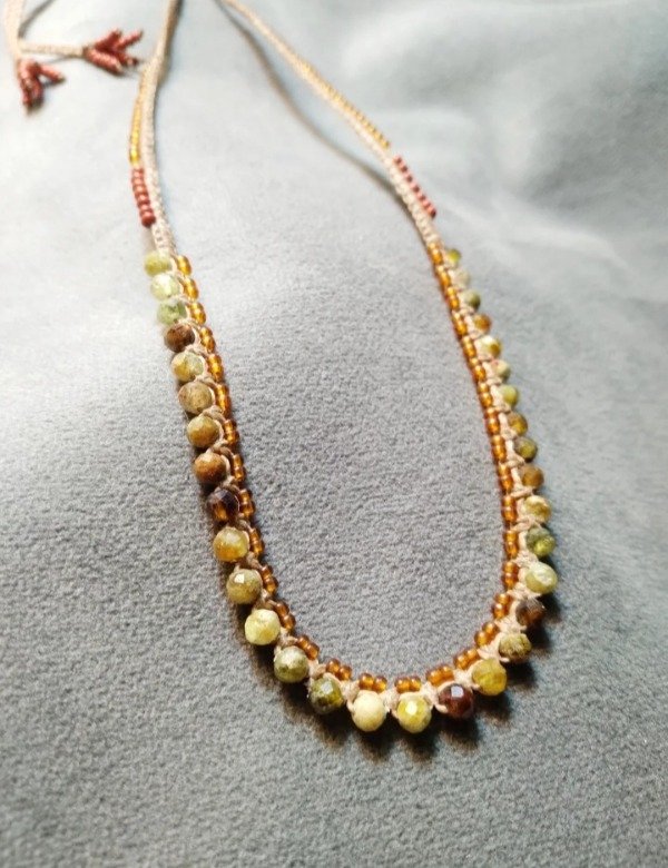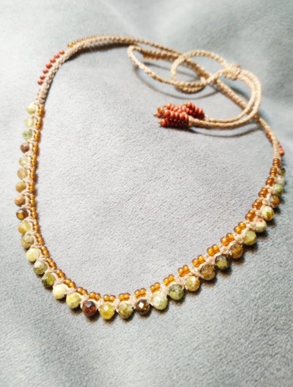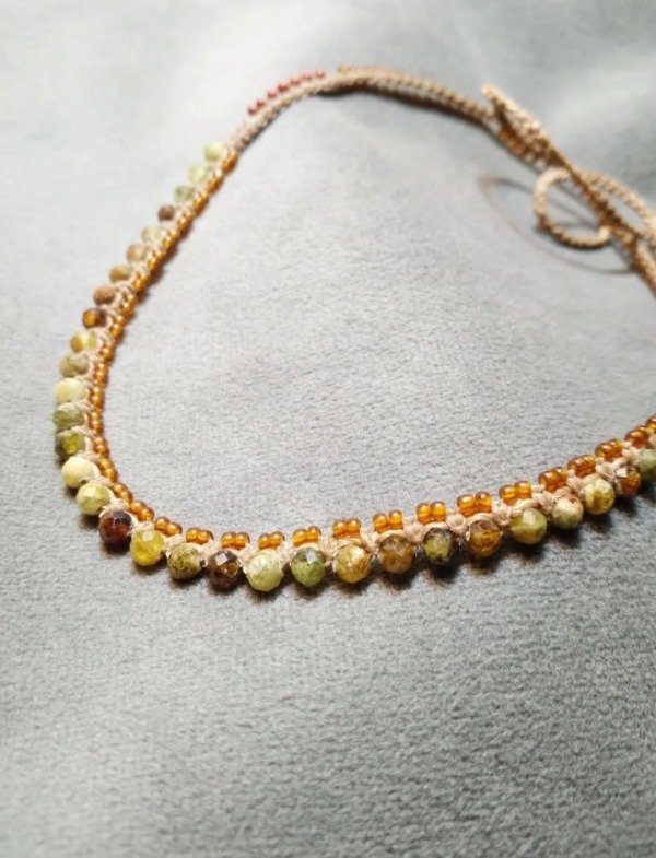 Gargantilla tejida en micromacramé con Granate verde y mostacillas de vidrio checo.