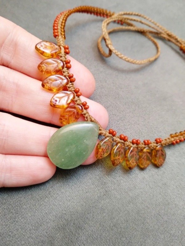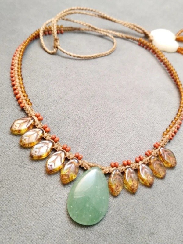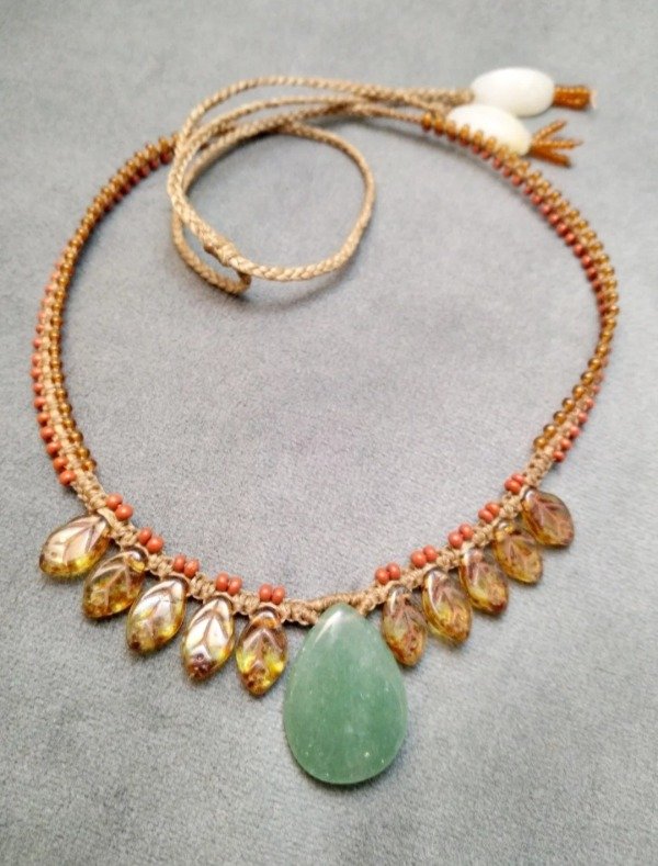 Gargantilla tejida en micromacramé con aventurina verde, hojita de vidrio japonés y mostacillas de vidrio checo.