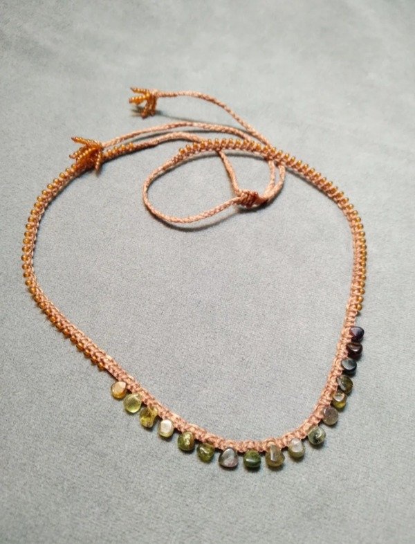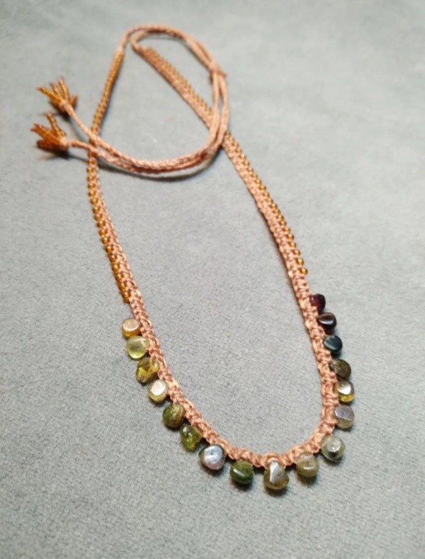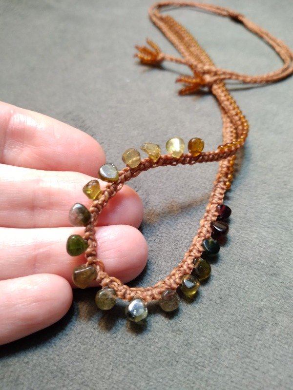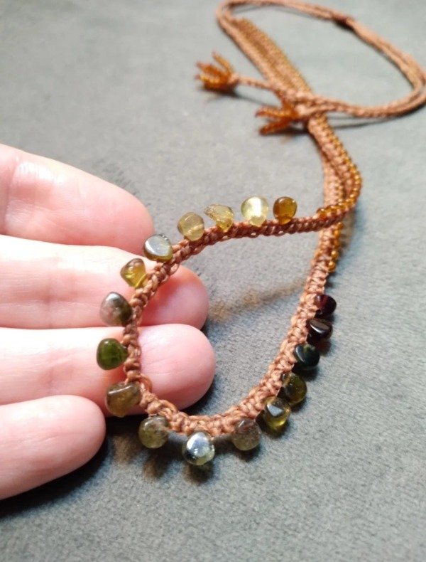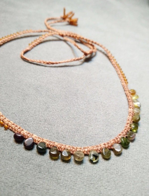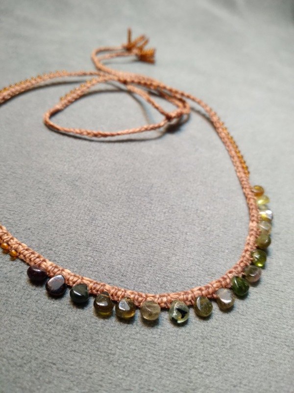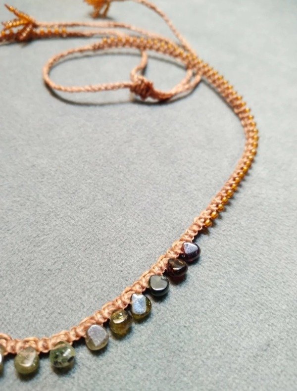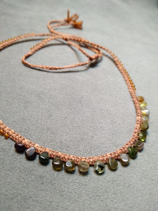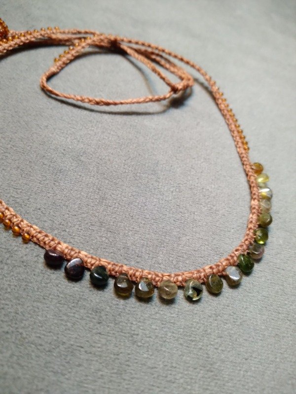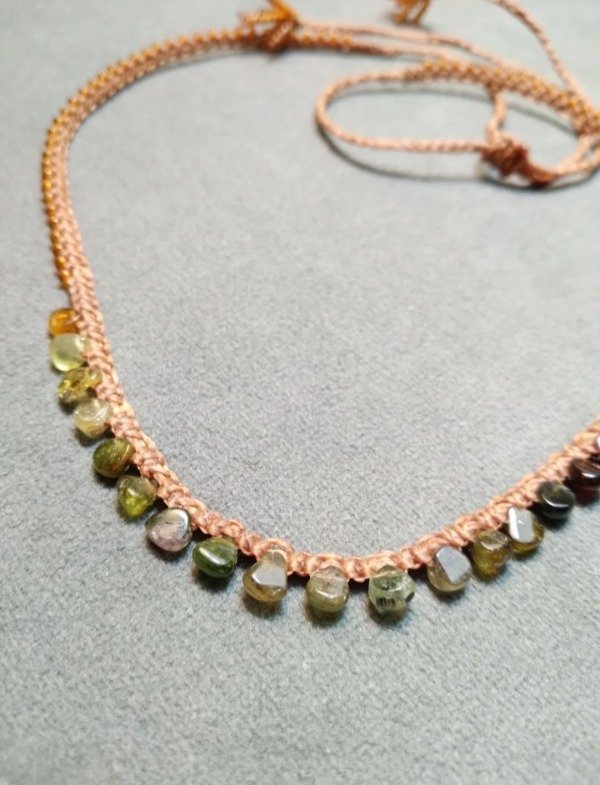 Gargantilla tejida en micromacramé con mini gotas de Turmalinas verde en degradé.