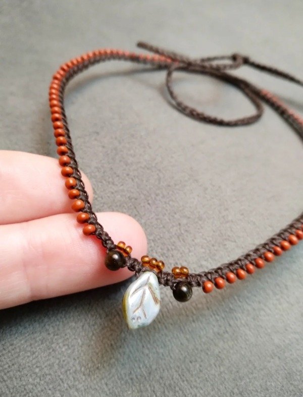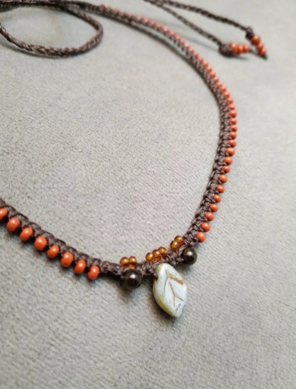 Gargantilla tejida en micromacramé con hojita de vidrio japonés, obsidiana dorada y mostacillas de vidrio checo.