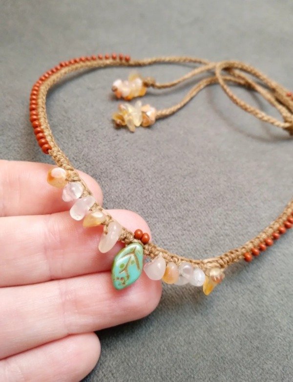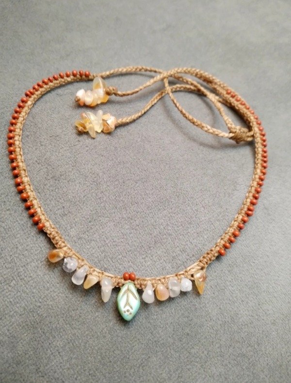 Gargantilla tejida en micromacramé con hojitas de vidrio japonés, ágata y mostacillas de vidrio checo.