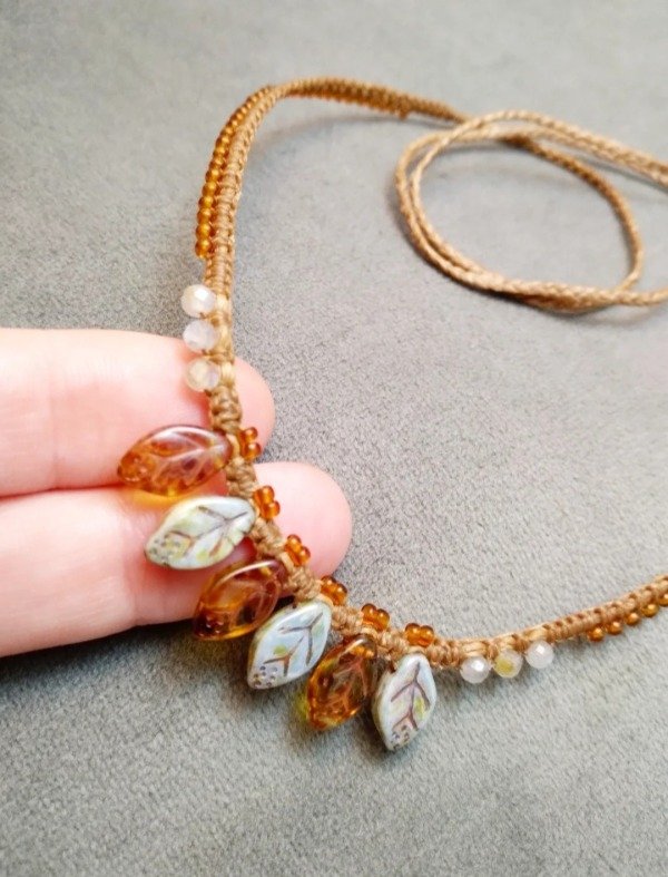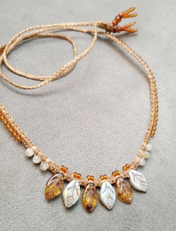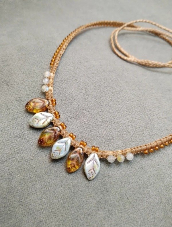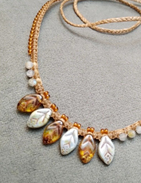 Gargantilla tejida en micromacramé con hojitas de vidrio japonés, labradorita y mostacillas de vidrio checo.