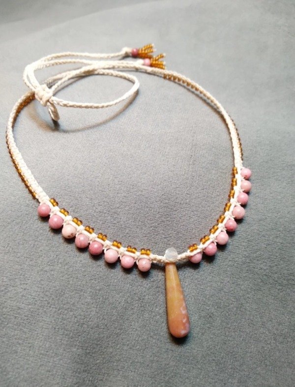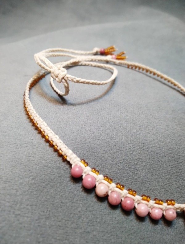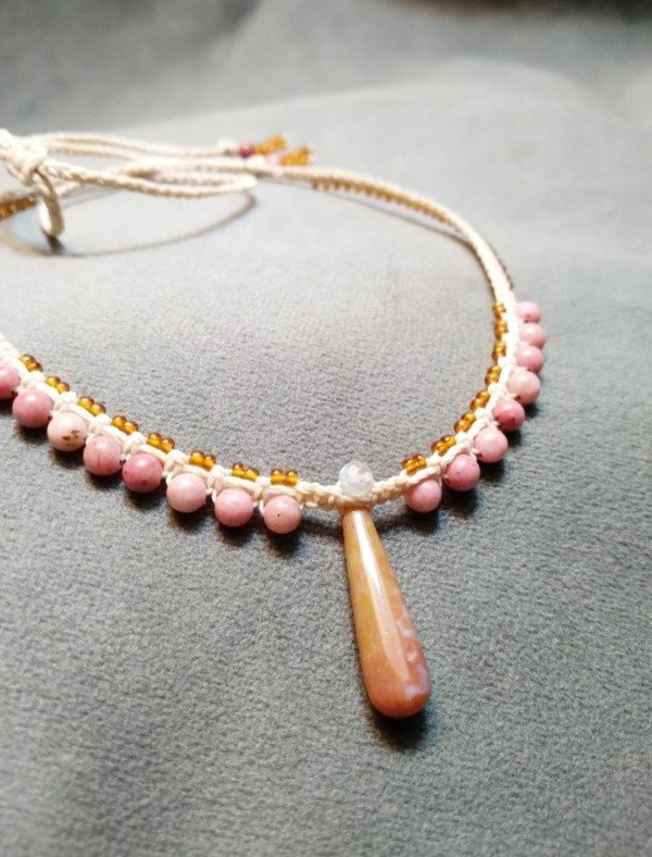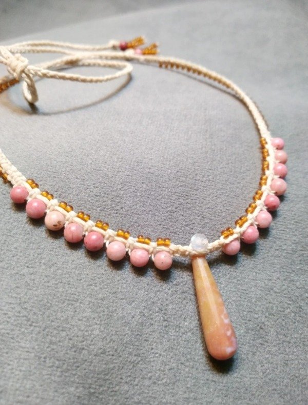 Gargantilla tejida en micromacramé con piedra Jaspe en el centro (2.5x1cm) rodonita y mostacillas de vidrio checo.