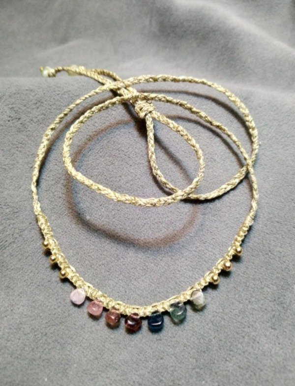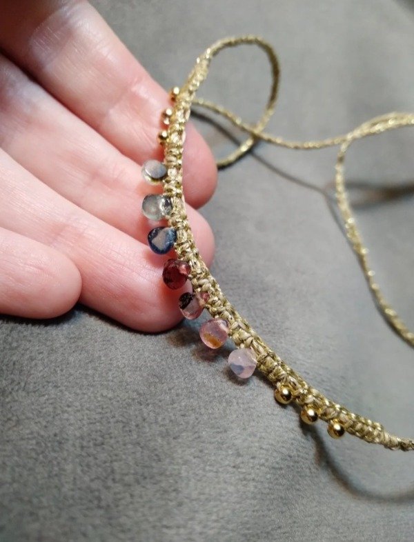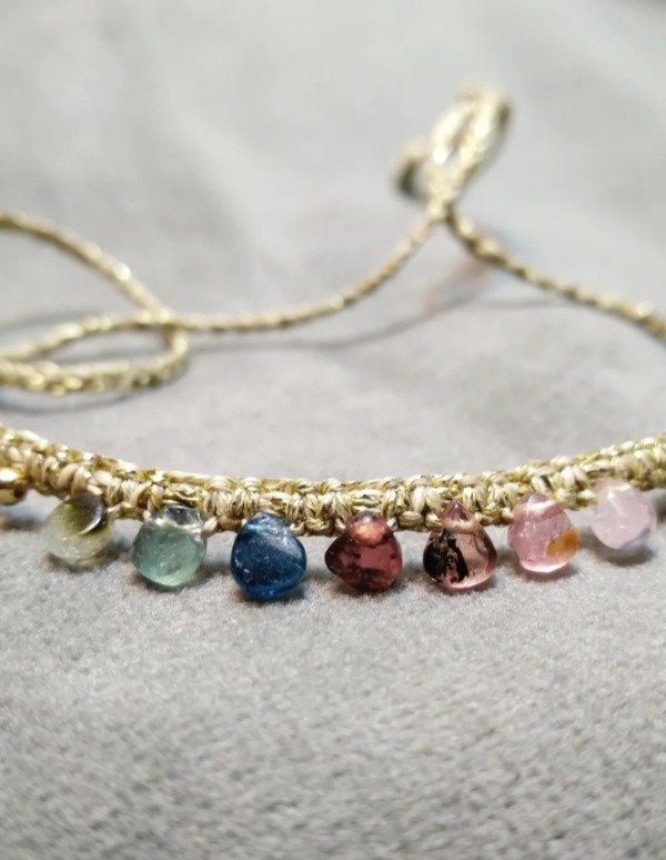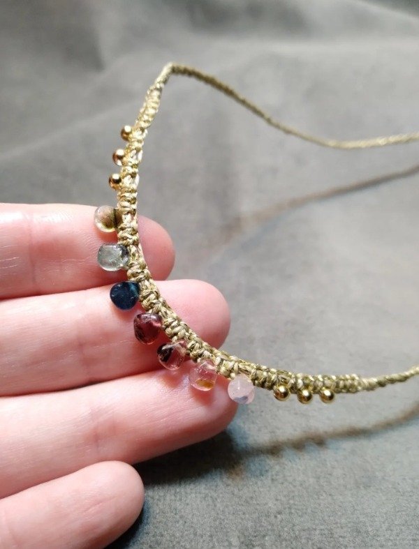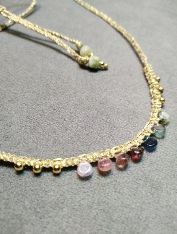 Gargantilla tejida en micromacramé con mini gotas de Turmalinas y bolitas de cobre laminado en oro de 24k.