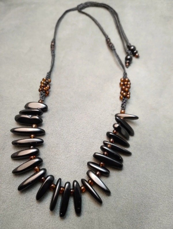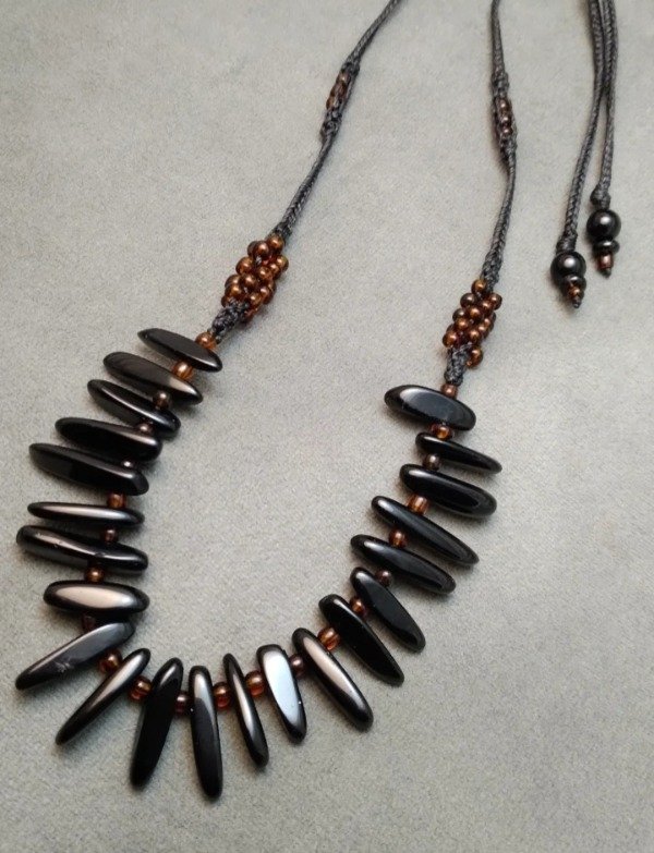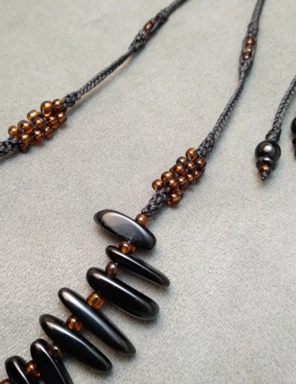 Gargantilla tejida en macramé con puntas de obsidiana negra y mostacillones de vidrio checo.