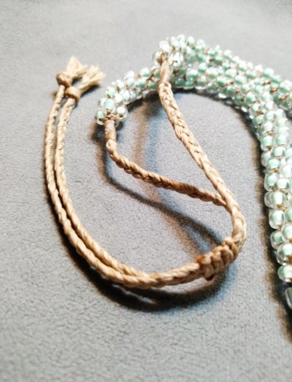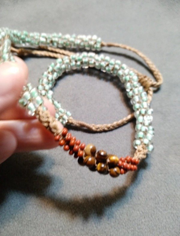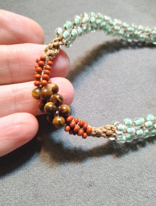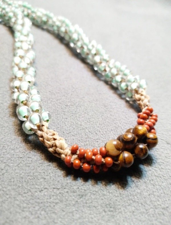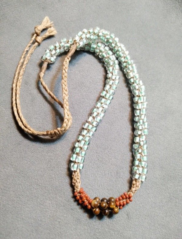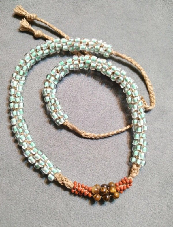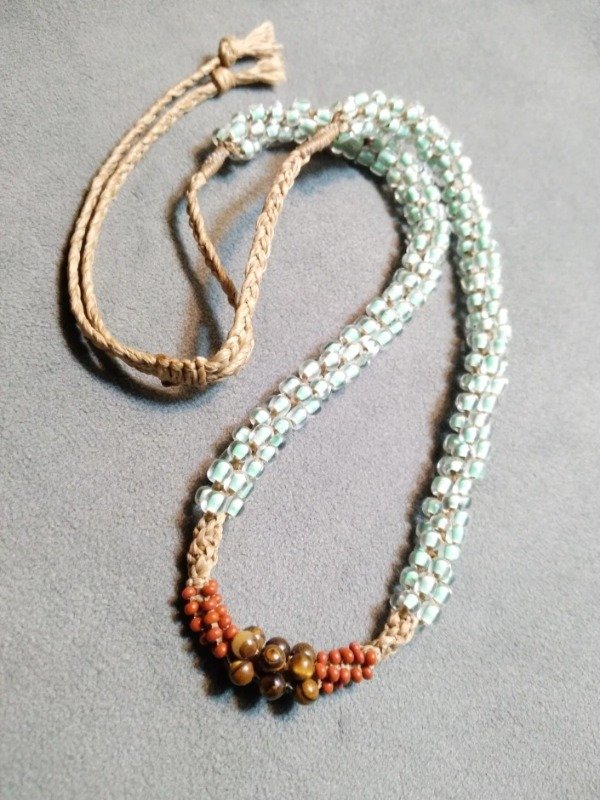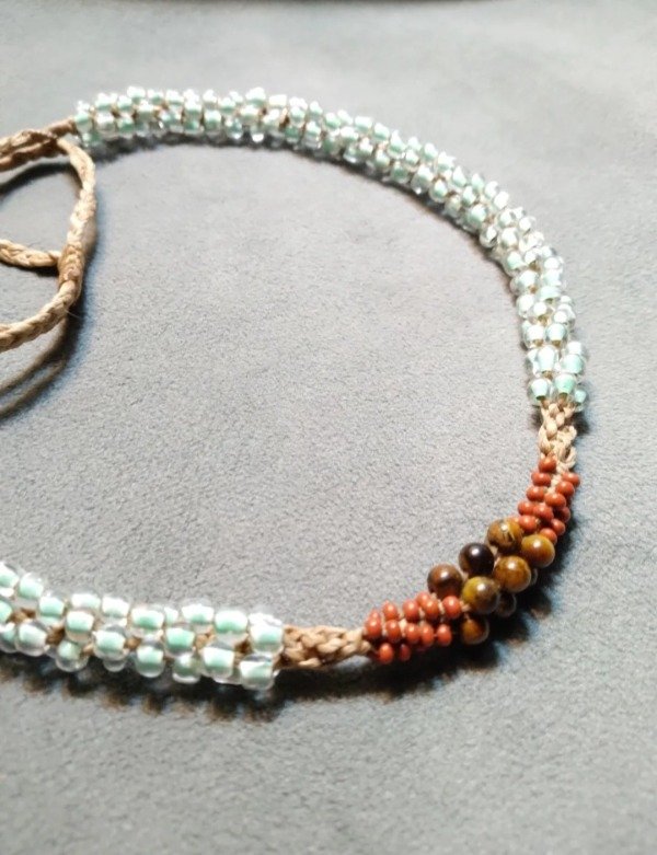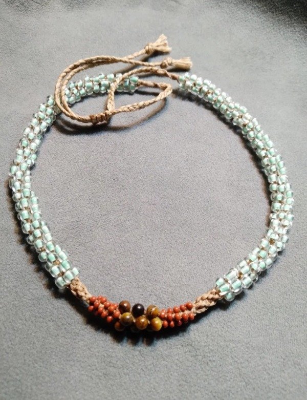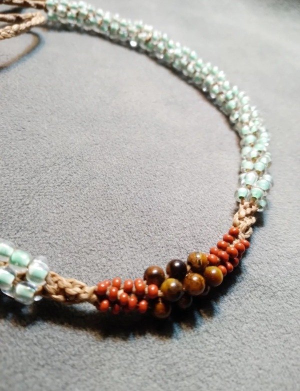 Gargantilla tejida en micromacramé con Ojo de tigre en el centro, mostacillas y mostacillones de vidrio checo