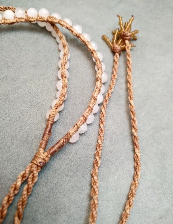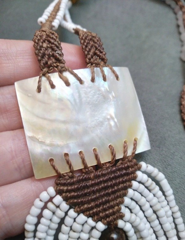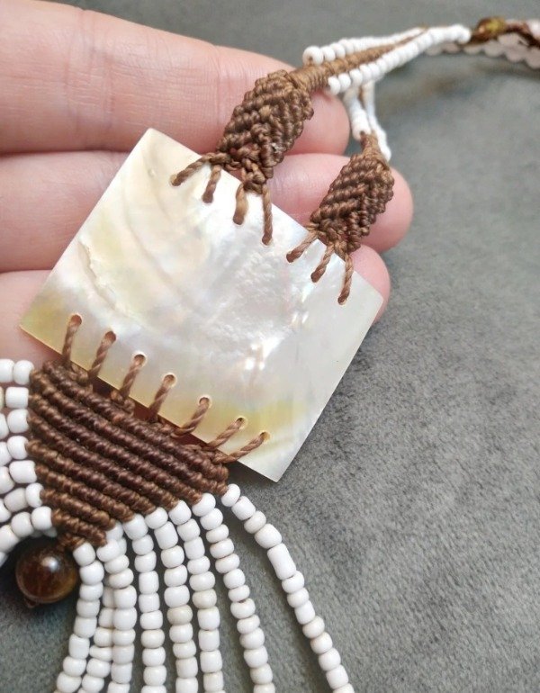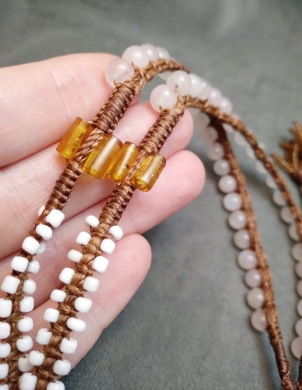 Collar tejido en micromacramé con centro de Madre perla, cuerdas con cuarzo rosa y detallees en ojo de tigre y ámbar mexicano