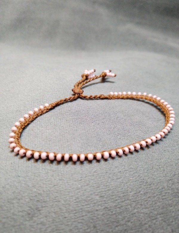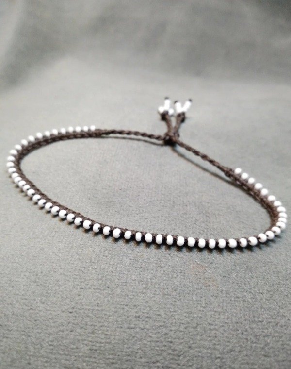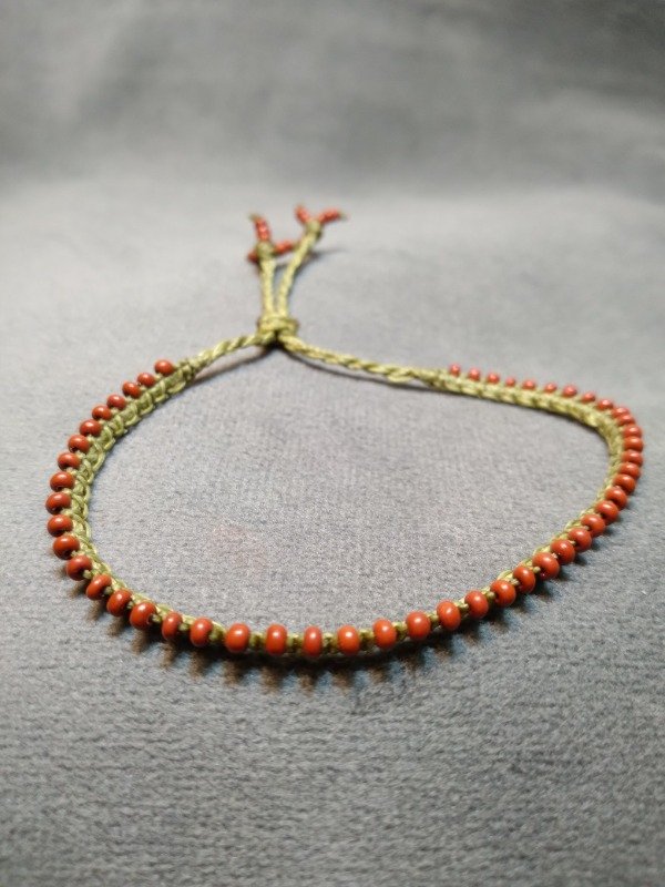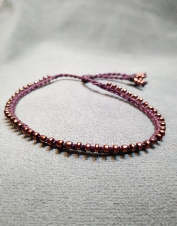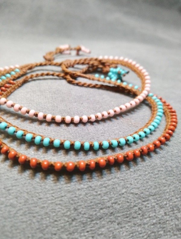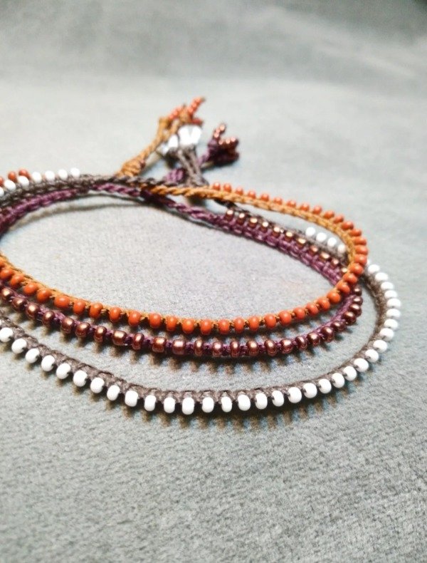 Pulsera tejida en micromacramé con mostacillas de vidrio checo. Ajustables con nudo corredizo.