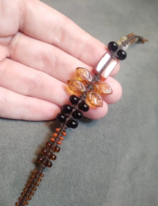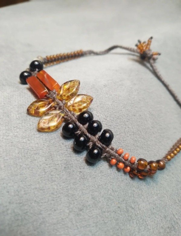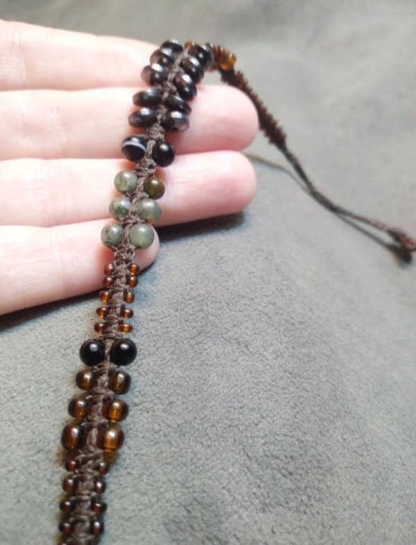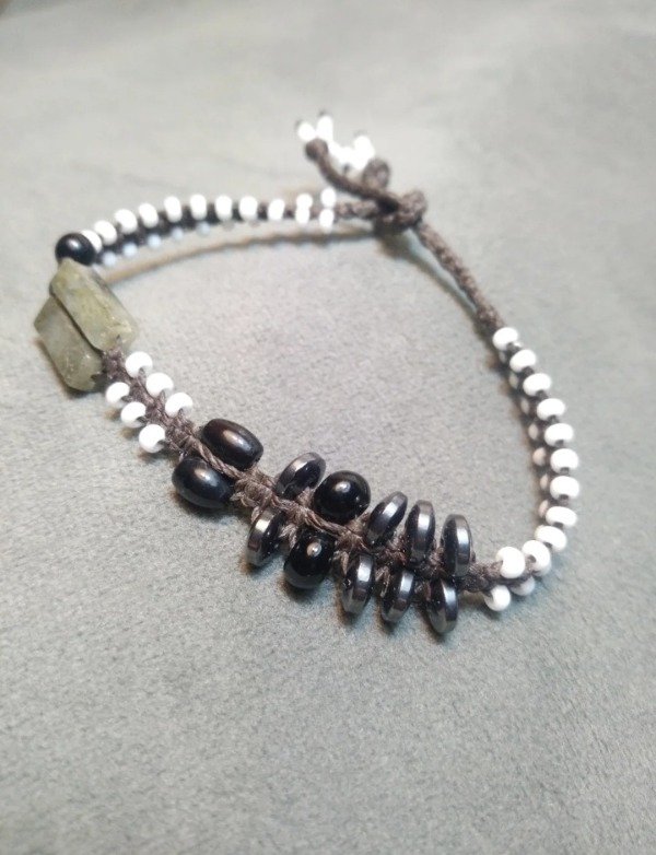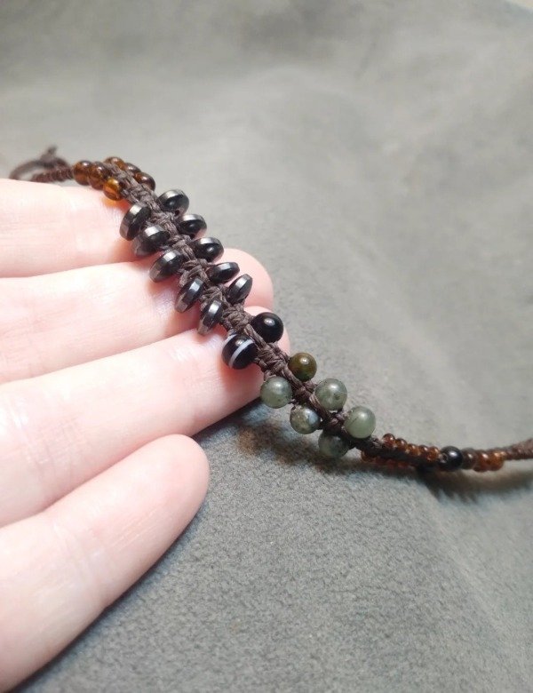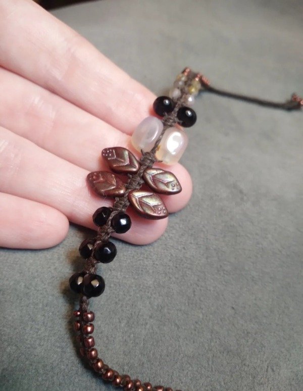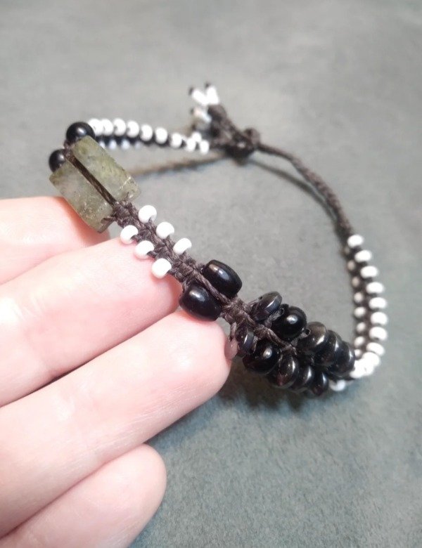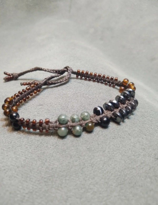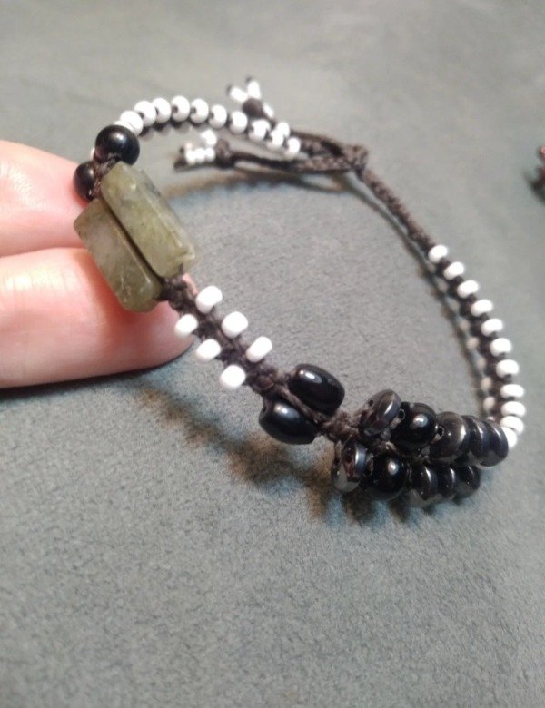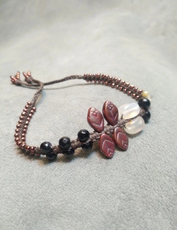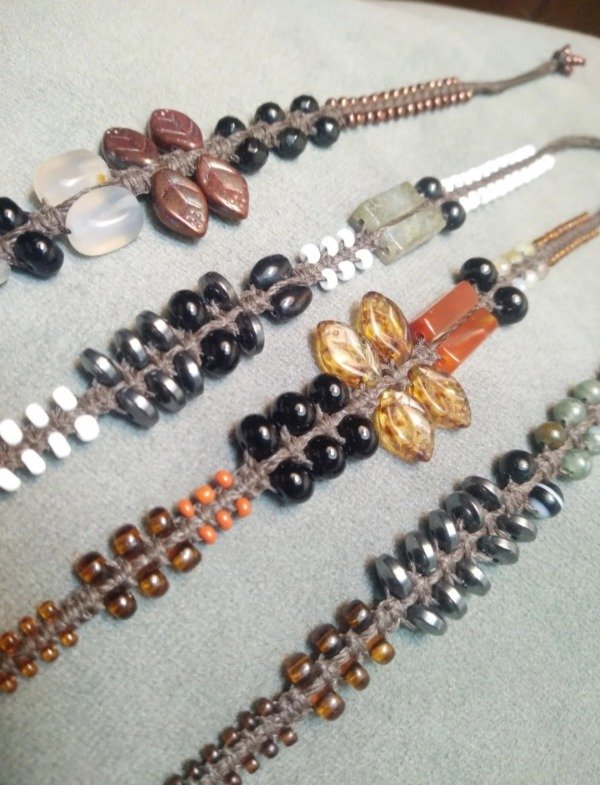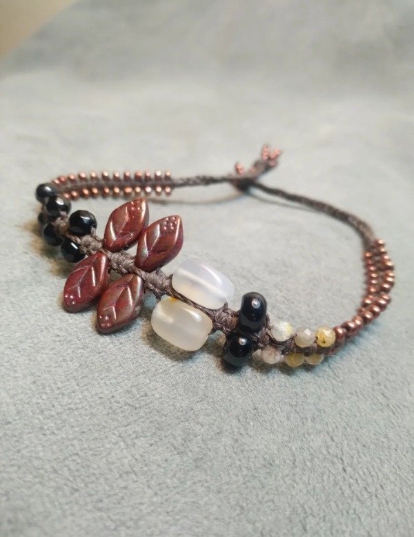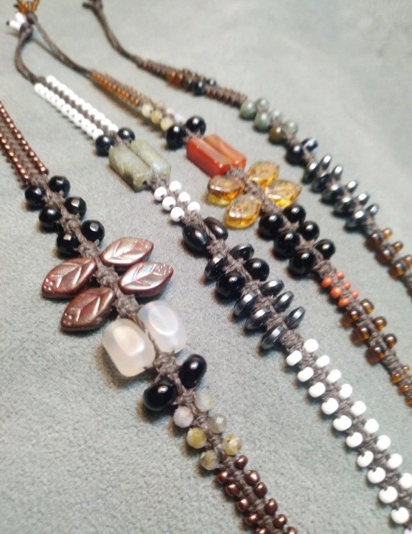 Pulseras tejidas en micromacramé con piedras naturales, hojitas y mostacillas de vidrio checo y japonés.
