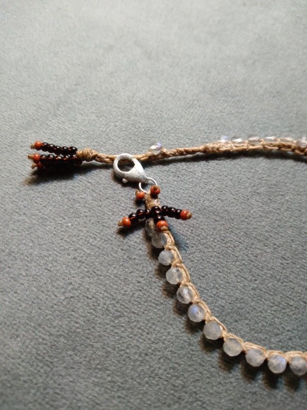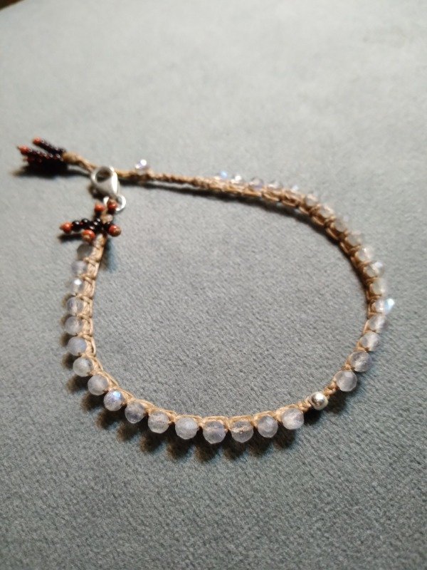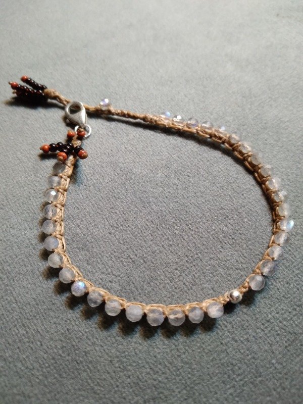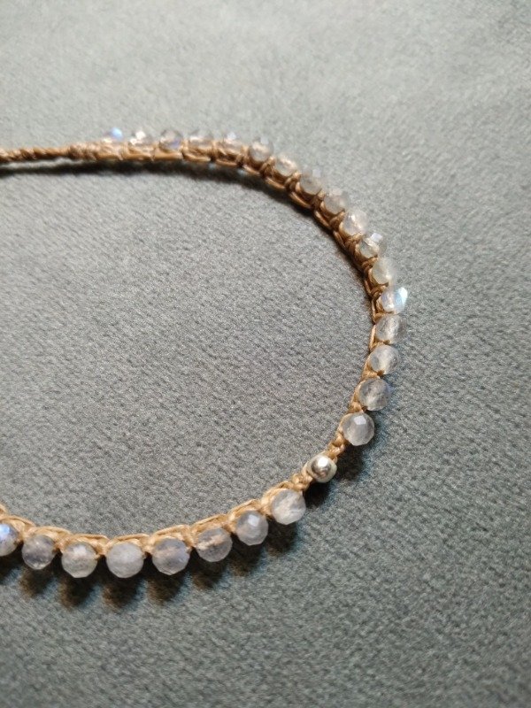 Pulsera tejida en micromacramé con labradorita azul facetada de 3mm con una perla de plata en el centro.